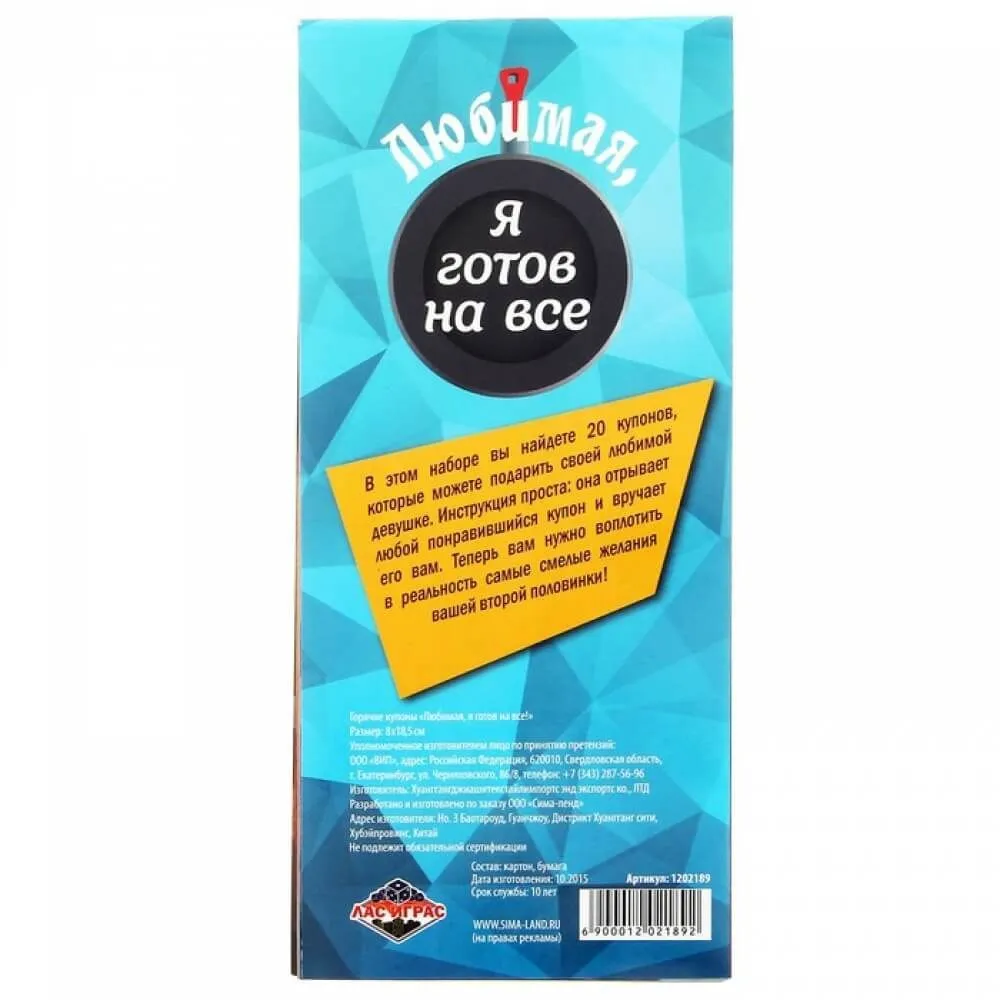 Горячие купоны "Любимая, я готов на все" от компании Сима Ленд дадут Вам множество прекрасных идей, как порадовать и приятно удивить свою возлюбленную. На каждом из купонов Вы найдете подробные задания, которые точно понравятся Вашей второй половинке! Внесите капельку страсти и нежности в ваши отношения. Такой подарок порадует не только ее, но и Вас, ведь за каждым исполнением желания непременно будет следовать страстное продолжение.