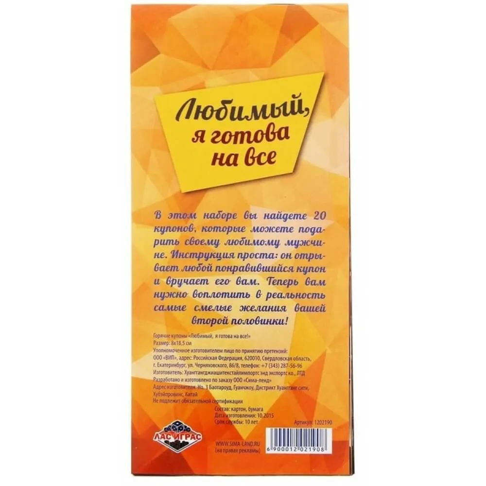 Горячие купоны "Любимый, я готова на все" от компании Сима Ленд дадут Вам множество прекрасных идей, как порадовать и приятно удивить своего возлюбленного. На каждом из купонов Вы найдете подробные задания, которые точно понравятся Вашей второй половинке! Внесите капельку страсти и нежности в ваши отношения.