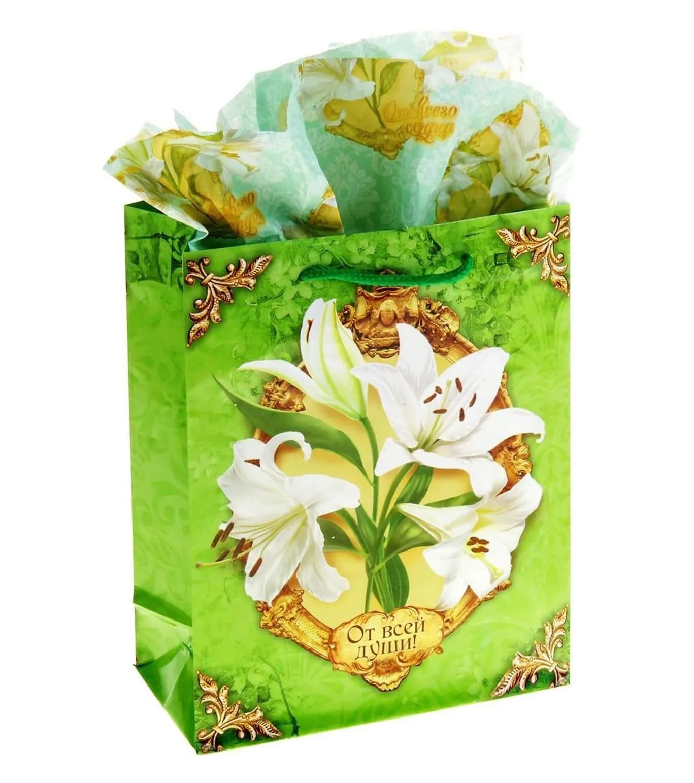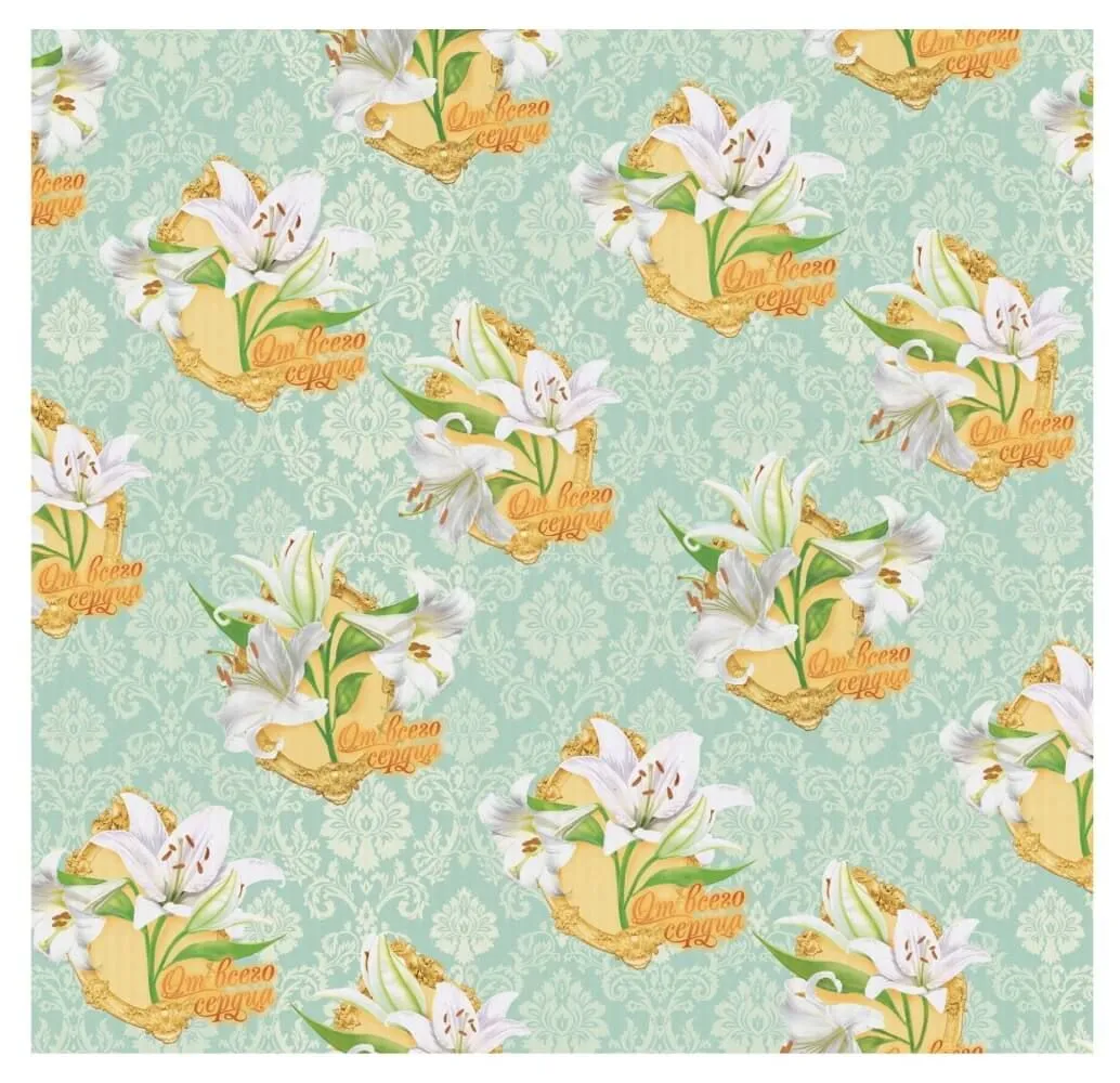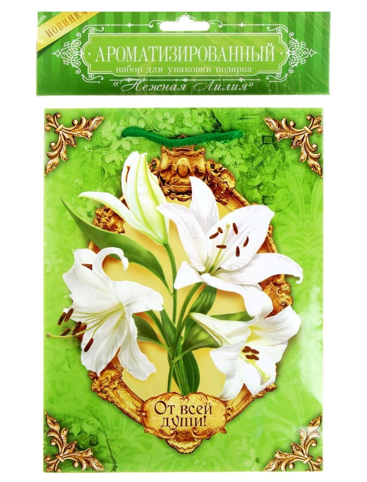 В набор "Нежная лилия" от компании Сима Ленд входят ламинированный пакет и бумага тишью, с изображенными на них прекрасными белыми лилиями. Секрет упаковочной бумаги заключается в наличии у нее нежного аромата лилии, который пробудит только нежные чувства своим благоуханием.