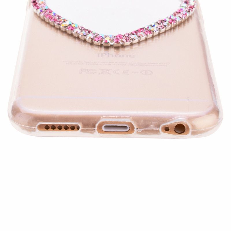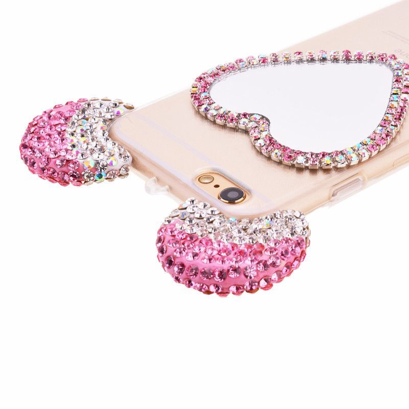 Очень милый чехол для iPhone 6/6S украсит собой Ваш телефон, буквально превратив его в сияющую драгоценность. Ушки мышки с переливающимися стразами будут ярко сверкать на свету, привлекая внимание. Сзади на чехле есть зеркальце в виде сердечка, также украшенное стразами, в которое в любой момент можно будет посмотреться, чтобы проверить макияж или просто полюбоваться собой.