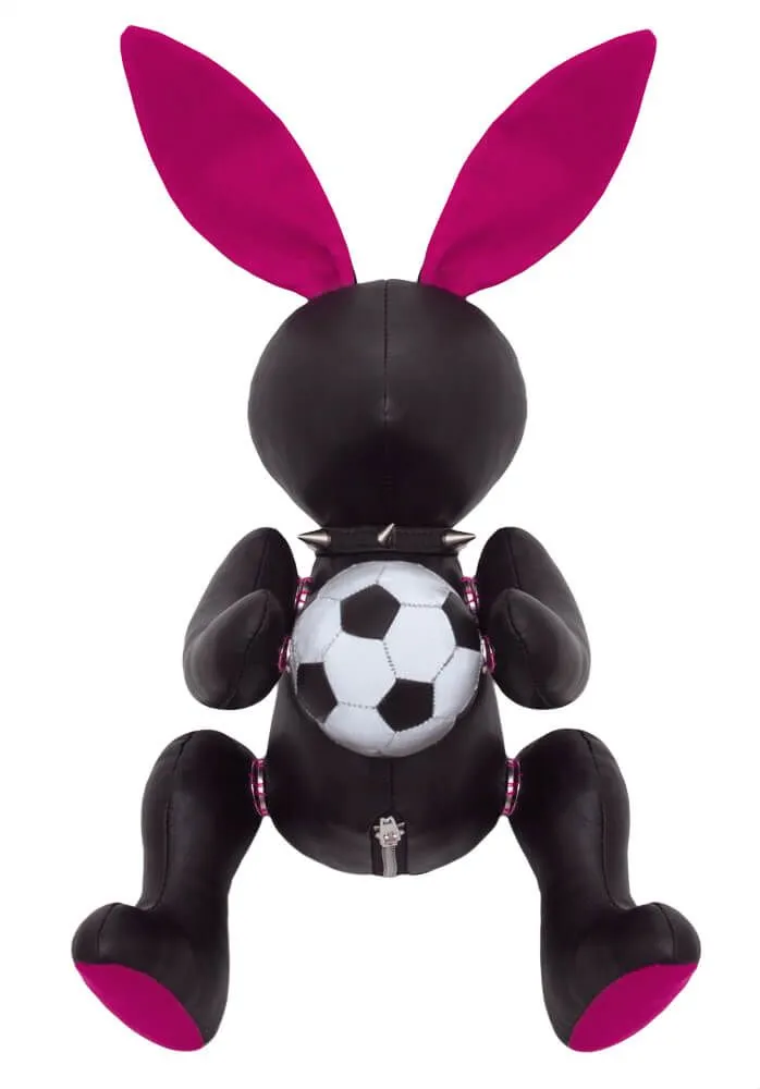 Этот Заяц с футбольным мячом, выполненный вручную из натуральной кожи, может стать весьма необычным подарком для всех любителей футбола. Облик этого зайца сразу говорит о том, что это не простая игрушка - ошейник с шипами и мордочка без глаз придают ему по-настоящему дерзкий вид. Лапки зайца подвижны, они крепятся к телу при помощи магнитов, поэтому Вы сможете легко придать ему нужное положение или вовсе отделить их. В туловище игрушки в самом низу есть небольшой кармашек на молнии, который можно использовать для хранения всяких мелочей. Ошейник застегивается на кнопку, при необходимости его можно снять. Длина без ушей: 33 см.