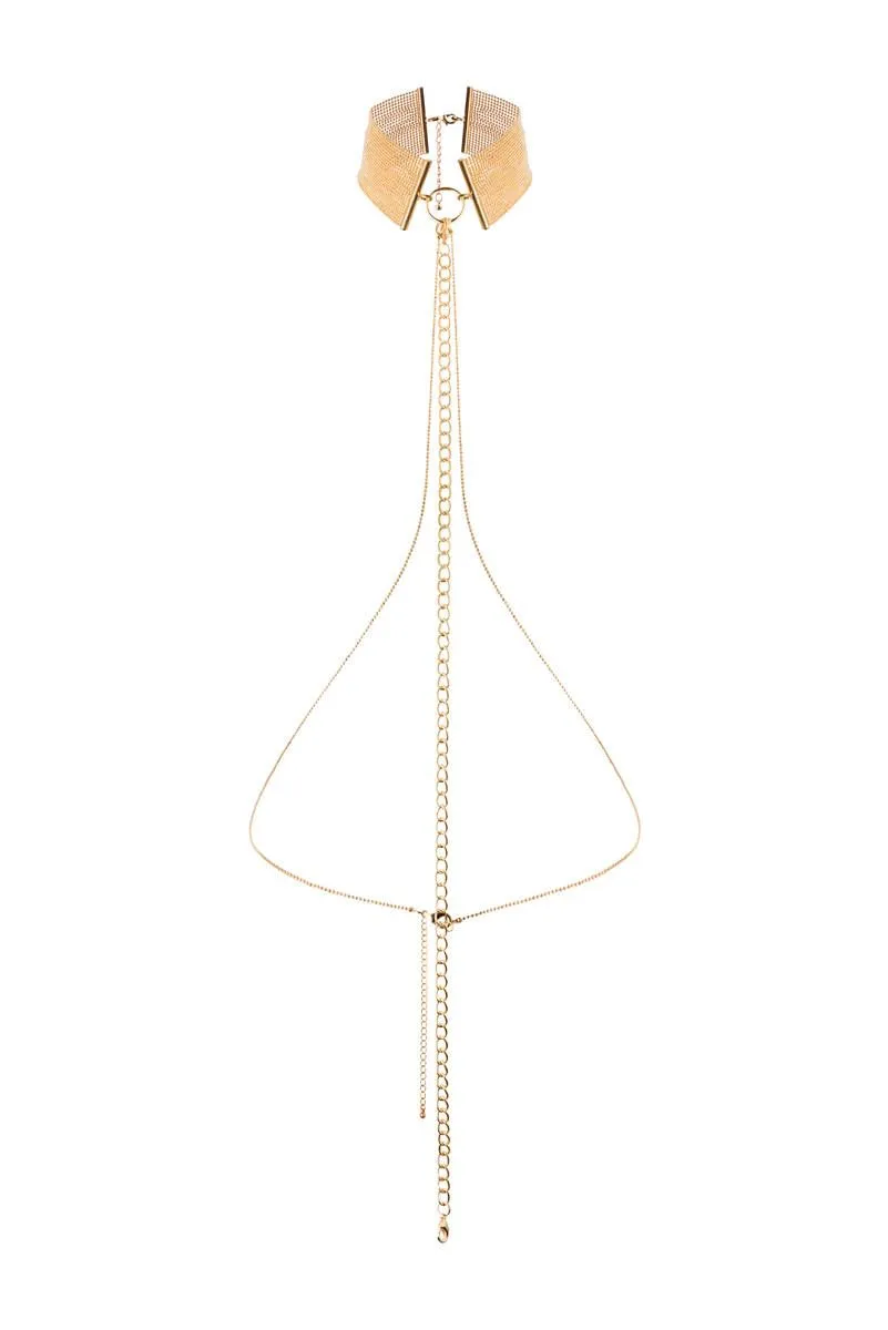 Элегантный чокер Metallic Chain Choker из серии Magnifique от бренда Bijoux Indiscrets - это необычный аксессуар, который можно использовать и как украшение, и как аксессуар для бондажа. Дизайн аксессуаров из серии Magnifique был навеян танцовщицами кабаре в Нью-Йорке двадцатых годов, чья чувственность и соблазнительность присутствовали в каждой детали их образа. При выходе в свет чокер подчеркнет Вашу элегантность и уникальный стиль, а в приватной обстановке с Вашим возлюбленным он превратится в оружие соблазнения. Используя карабины, к цепочкам чокера можно присоединять различные бондажные аксессуары, чтобы ограничить Вашу подвижность. Он отлично сочетается с наручниками из этой же серии. Чокер регулируется по длине.