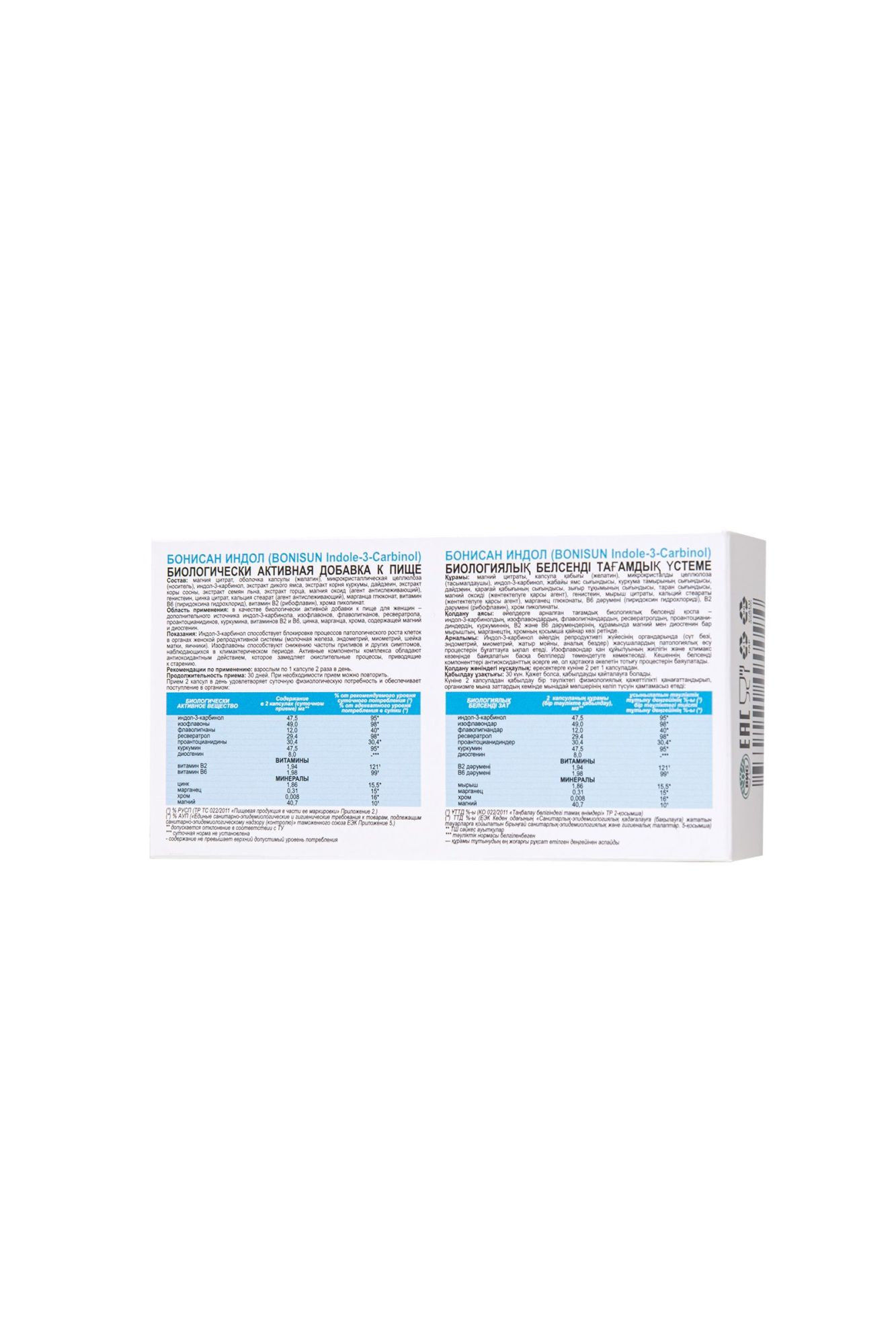 Бонисан ИНДОЛ (BONISUN Indole-3-Carbinol) – женская негормональная комплексная формула с индол-3-карбинолом, изофлавонами, минералами, витаминами группы В и природными (полученными из экстрактов растений) флаволигнанам, ресвератролом, куркумином, проантоцианидинами и диосгенином. Бонисан ИНДОЛ способствует: поддержке регуляции пролиферативных процессов в молочной железе, эндометрии, миометрии, шейки матки, яичниках. блокировке процессов патологического клеточного роста в органах и тканях женской репродуктивной системы. снижению симптомов климактерического периода. нормализации уровня половых гормонов. снижению приливов, ночной потливости, перепадов настроения. регуляции нарушений сна и упадка сил. Каждый элемент комплекса обладает дополнительными свойствами, которые усиливают действие основных: Индол-3-карбинол (I3C) представляет собой соединение, которое образуется при употреблении крестоцветных овощей. Диета, богатая крестоцветными овощами (цветная капуста, брокколи, белокочанная капуста, кольраби, зелень, рапс, брюква, репа), уже давно считается здоровой, их потребление способствует блокировке процессов патологического роста клеток в органах. Индол-3-карбинол способствует поддержке нормального баланса 2-гидрокси (хороших) и 16-гидрокси (плохих) эстрогенов и предупреждению образования метаболитов, которые вызывают возникновение опухолей в женских органах и тканях. Способствует замедлению процессов старения, поддержке процессов детоксикации, торможению формирования папилломатозных образований. Изофлавоны (генистеин и дайдзеин) это растительные соединения, обладающие эстрогеноподобным действием (фитоэстрогены). Изофлавоны содержатся в соевых бобах, красном клевере, люцерне и других растениях. Способствуют уменьшению количеству и силы вазомоторных и других проявлений климакса. Поддерживают хорошее самочувствие, здоровый метаболизм костной ткани, состояние кожи и слизистых оболочек. Магний участвует в более чем 300 ферментативных реакциях организма. Способствует снижению нервного напряжения, беспокойства и стресса; поддержке уровня клеточной энергии и поддержке здорового сердечного ритма и частоты сердечных сокращений; помогает расслабить как гладкие, так и скелетные мышцы, способствует поддержке при симптомах мигрени. Цинк в качестве катализатора активирует более чем 200 ферментов и является компонентом многих белков, гормонов, нейропептидов, гормональных рецепторов, а также непосредственно участвует в синтезе коэнзимов, производных пиридоксина. Способствует укреплению иммунитета, синтезу коллагена, поддержанию красоты кожи, волос и ногтей, регулированию деятельности сальных желез. Благоприятно влияет на состояние костей, зубов и мышц, способствует восстановлению барьерной функции кожи и уменьшению её воспаления. Марганец кофактор ферментов, участвующих в метаболизме глюкозы и углеводов, липидов, холестерина, в метаболизме аминокислот, в нейтрализации свободных радикалов кислорода, в свертывании крови и гемостазе, в костеобразовании и иммунном ответе. Хром участвует в обмене аминокислот и глюкозы, стимулирует накопление гликогена в мышцах, снижает аппетит, что позволяет избежать переедания. Повышенное потребление простых сахаров, физические нагрузки и стресс приводят к повышенной потере хрома. Вит