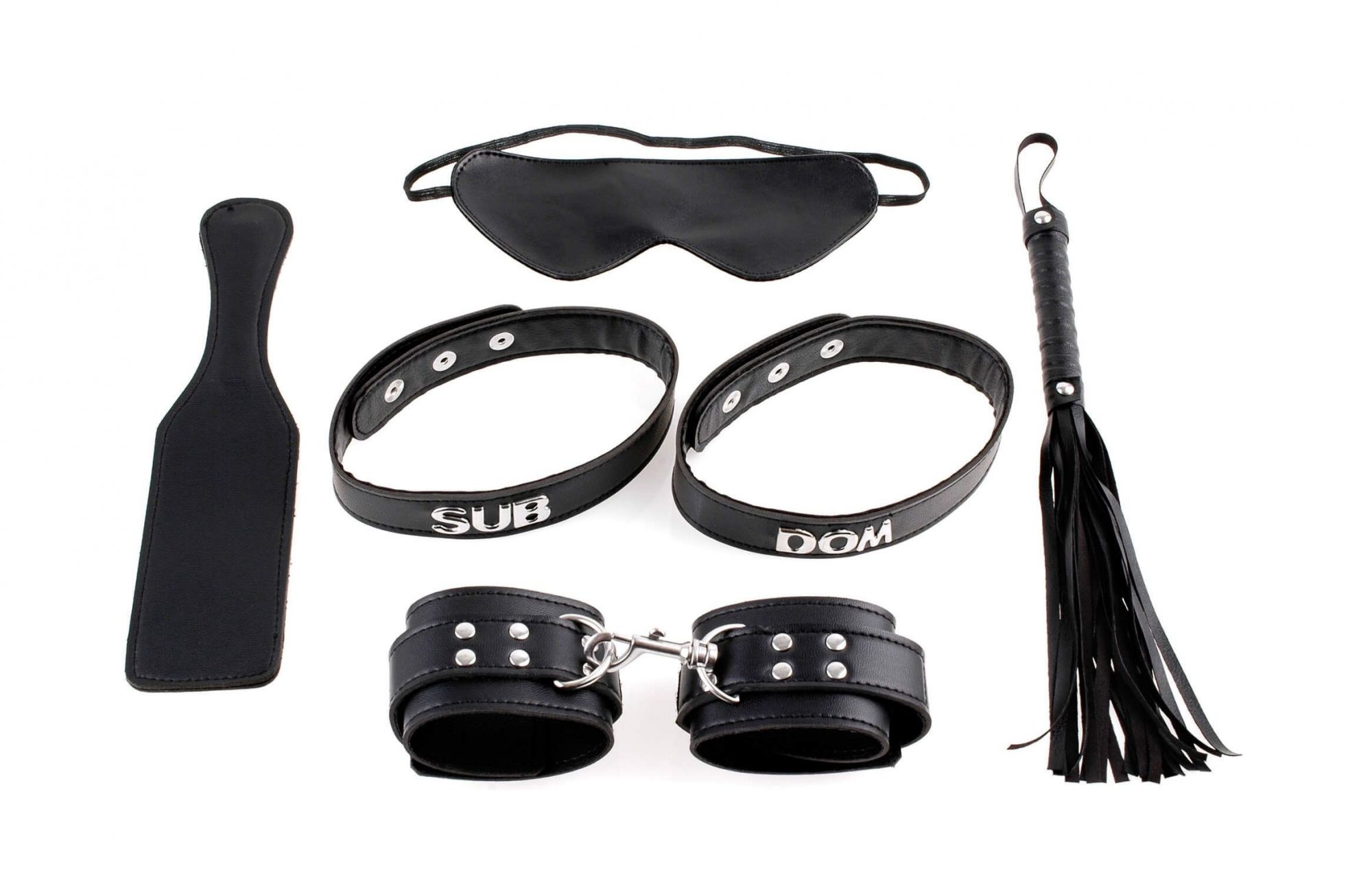 Набор Sub & Dom Kit от бренда Pipedream состоит из шести девайсов для БДСМ-сессий. В комплект входят: 2 ошейника с надписями «DOM» и «SUB», маска для глаз, плетка, лопатка и кожаные наручники. С этими аксессуарами интимная близость заиграет новыми красками и позволит получить ранее неизведанные удовольствия! Строгий черный цвет, удобные ошейники с надписями-указателями ролей и качество исполнения не оставят равнодушными как искушенных любителей БДСМ, так и новичков.