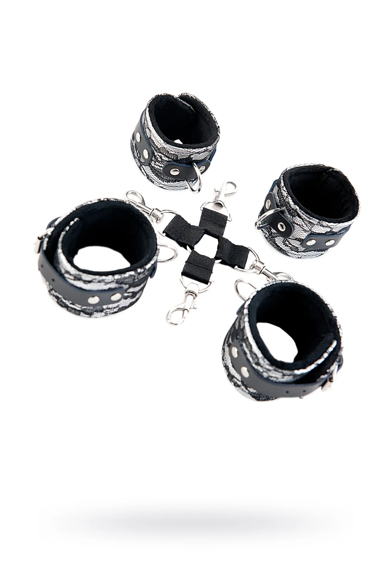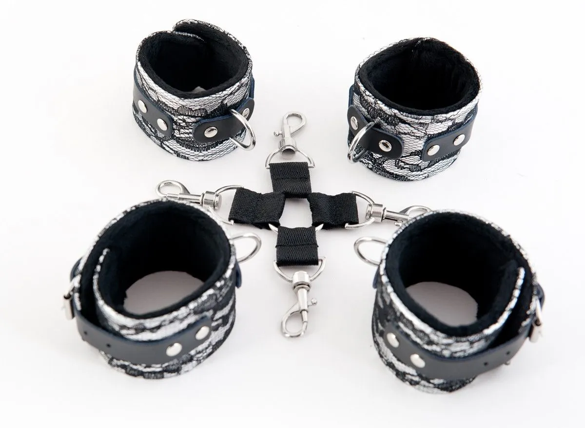 Этот кружевной бондажный комплект — потрясающий девайс для тех, кто желает превратить свою партнёршу в покорную королеву. Сцепка отлично фиксирует руки и ноги, полностью обездвиживая партнёршу. Но прелесть комплекта на этом не ограничивается — наручники и оковы легко снимаются! Это даёт возможность применять их и как отдельные атрибуты. Универсальность, изящность и надёжная фиксация — аксессуар с такими характеристиками без мощного сексуального наслаждения от бондажа не оставит.