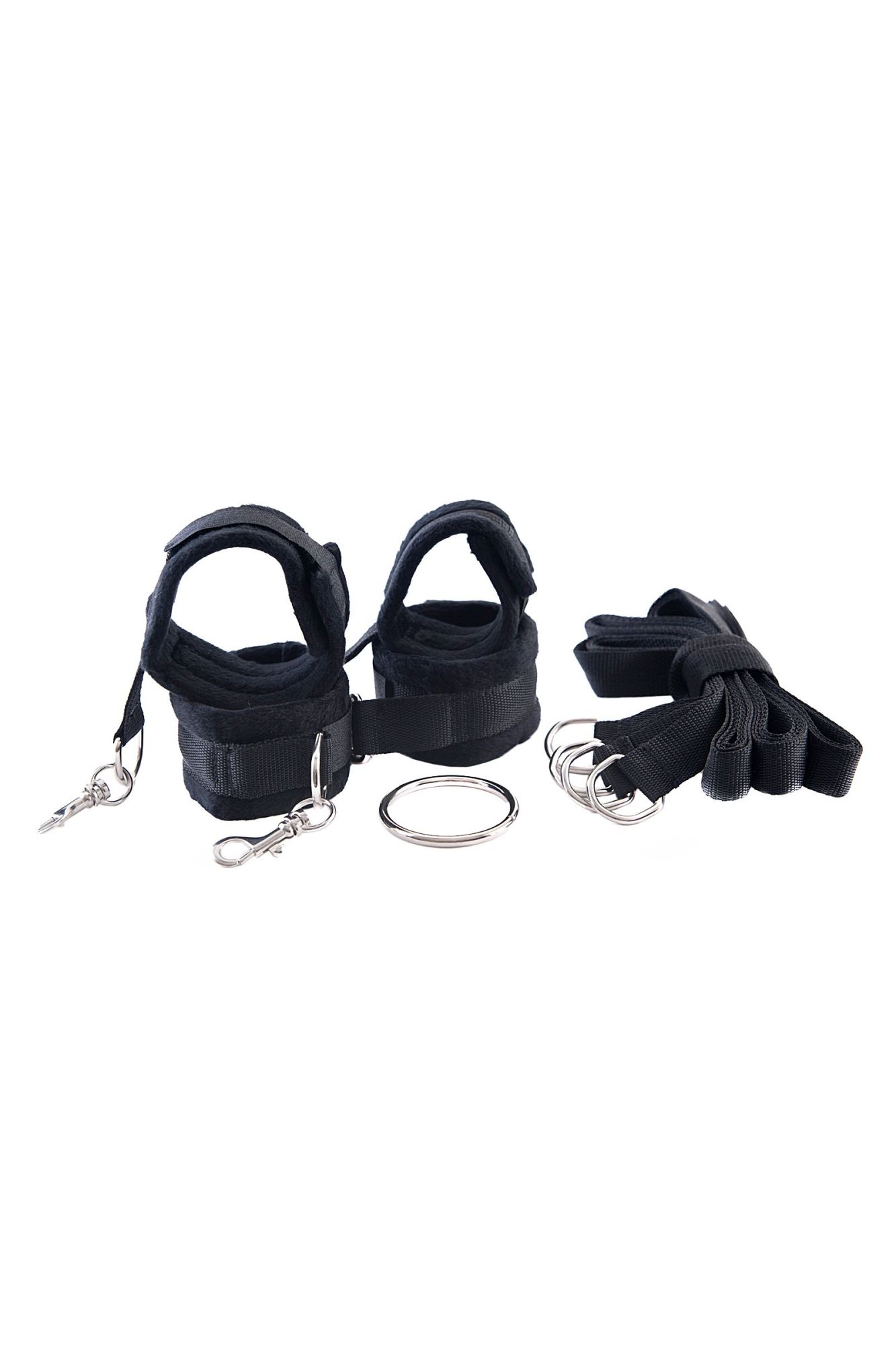 Этот фиксатор состоит из мягких оков и наручников, пристёгнутых замками к кольцу-держателю. Казалось бы, ничего особенного, но нет! Такое ограничение движения даёт возможность менять положение: фиксировать руки и ноги можно и спереди и сзади. Карабины и цепочки позволяют убрать кольцо и превратить сцепку в отдельные наручники и оковы. В комплект также входят четыре ремня: заменяем ими кольцо и вуаля — новые варианты фиксации готовы! Играть с таким аксессуаром одно удовольствие, ведь он не ограничивает в количестве сценариев.