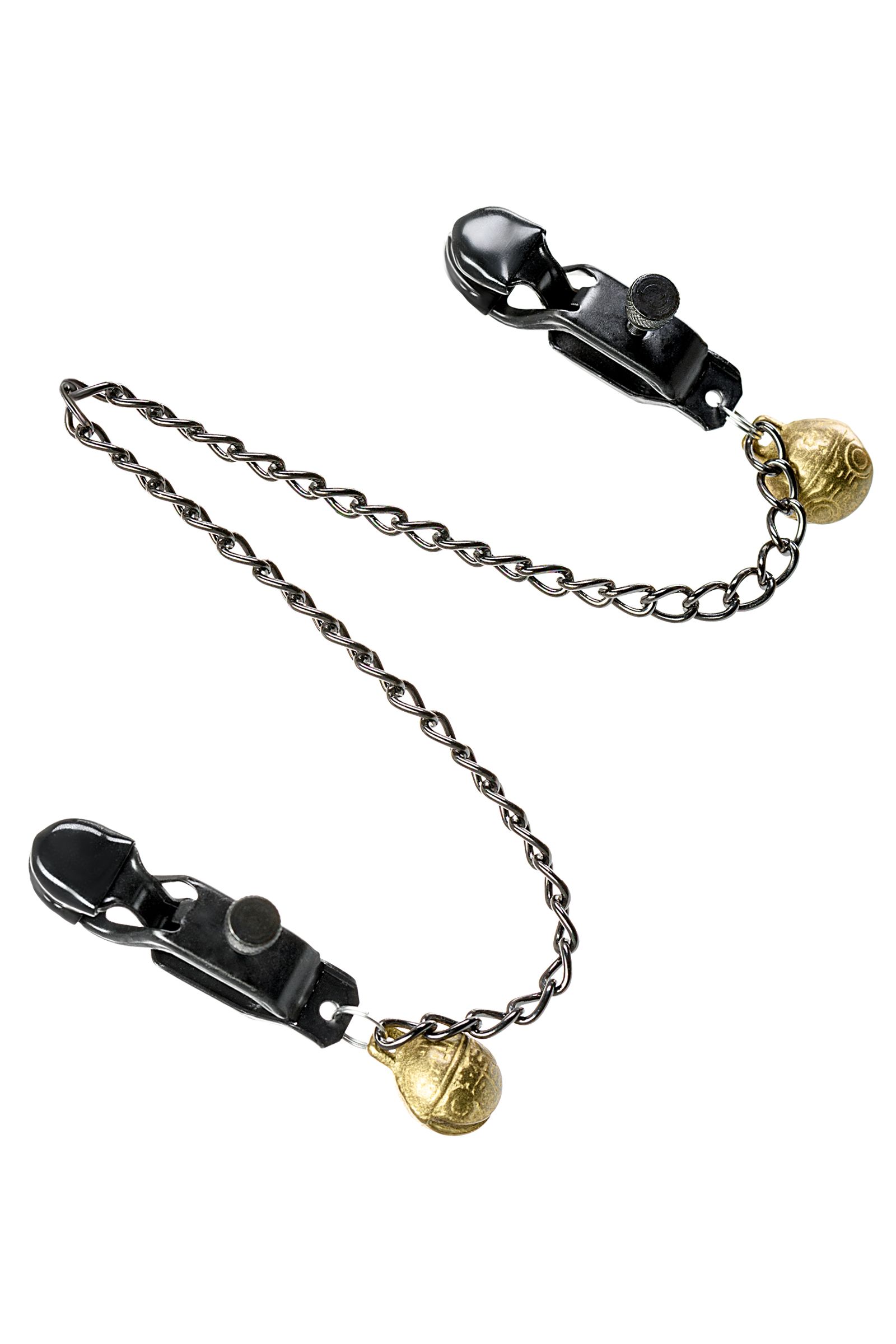 Металлические зажимы для сосков с этническим рисунком дополнены цепочкой. Они добавят перчинки в ваши игры: сами зажимы создадут дополнительную стимуляцию, а колокольчики озвучат каждое движение. Сила сжатия регулируется болтиком.