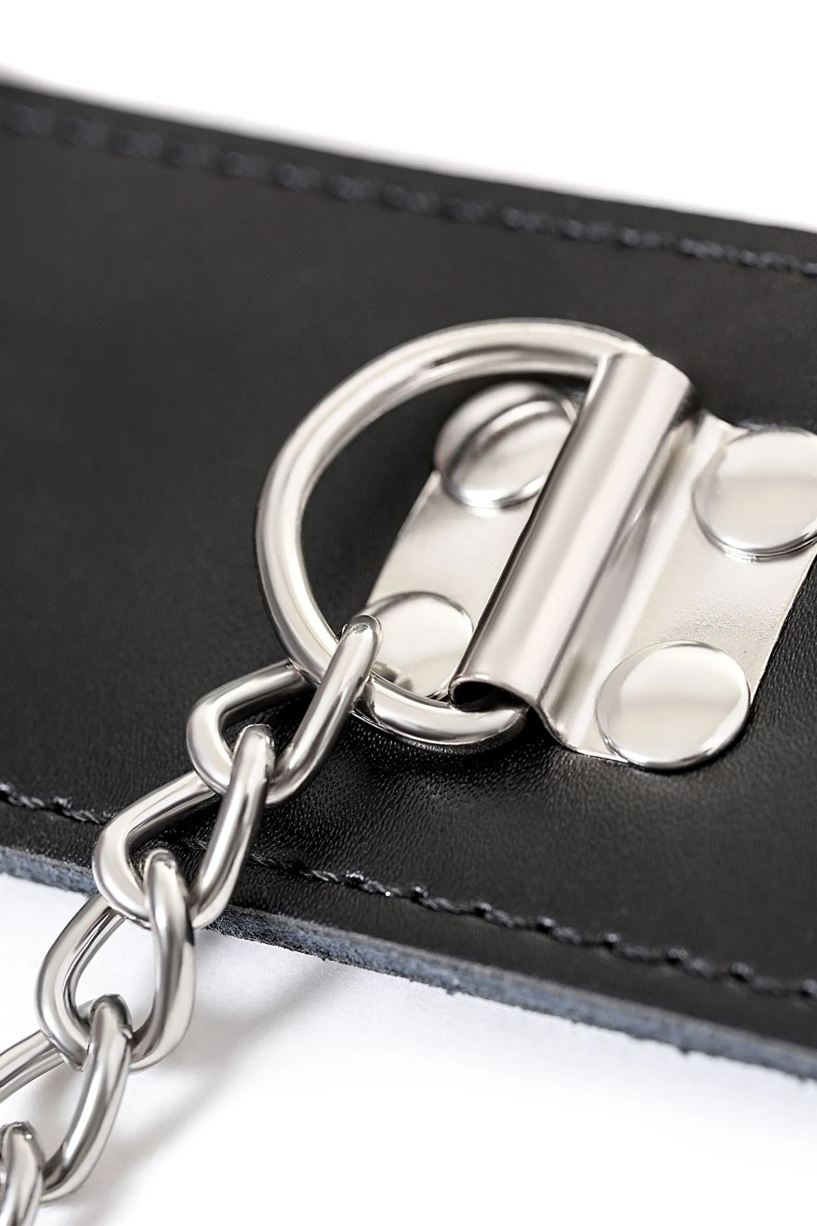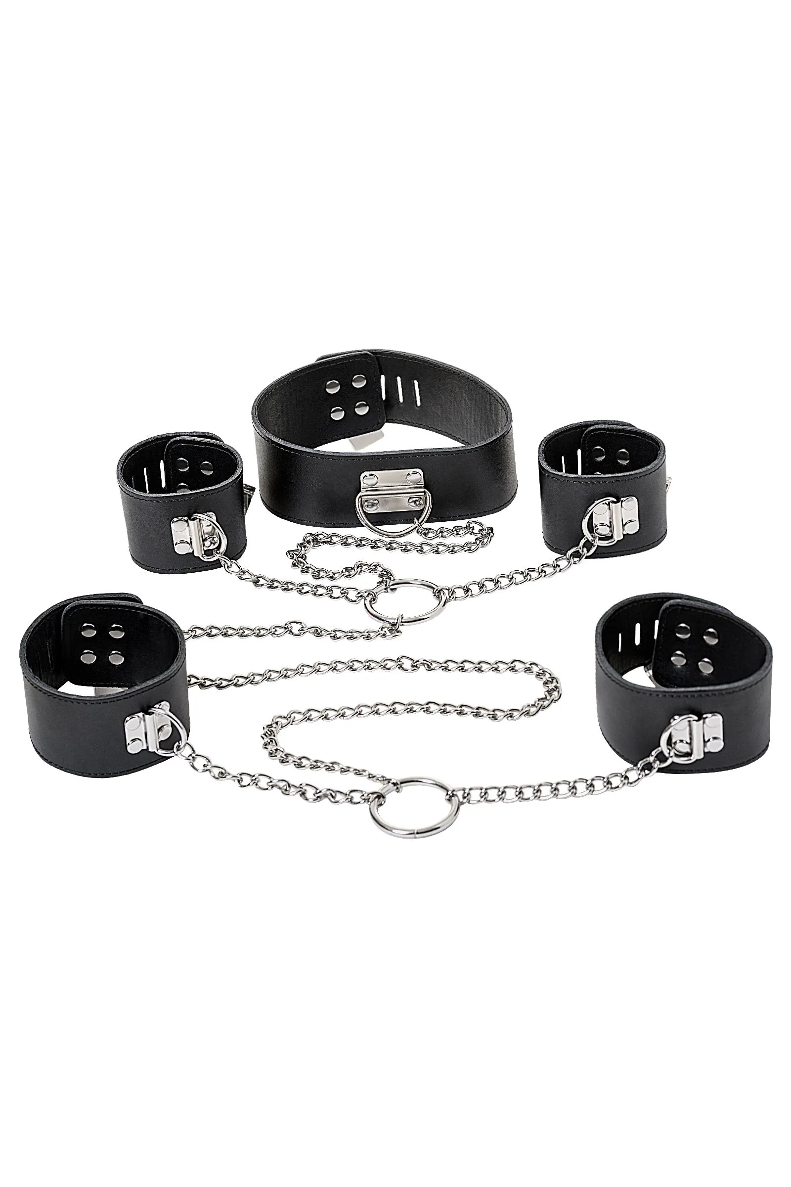 Для любителей тотального ограничения каких-либо движений придуман данный бондажный комплект. Металл, кожа и фиксация сразу трёх основных точек — шеи, рук и ног. Соединена конструкция 70-сантиметровой цепочкой, которая не позволит выпрямиться в полный рост. Расстояние между манжетами наручников и оков — 25 см. В этом комплекте продумано всё до мелочей: стиль, безопасность и Контроль с большой буквы.