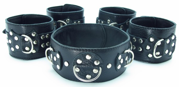 Набор аксессуаров, изготовленных из натуральной кожи. В него входят: наручи и поножи, украшенные заклепками (ширина - 6 см), которе можно соединять и комбинировать между собой при попощи цепей с карабтинами (входят в комплект) Размер меняется при помощи застежки. Так же имеется черный ошейник, шириной 4,5 см, с одним кольцом. Размер регулируется застежками на кнопках.
