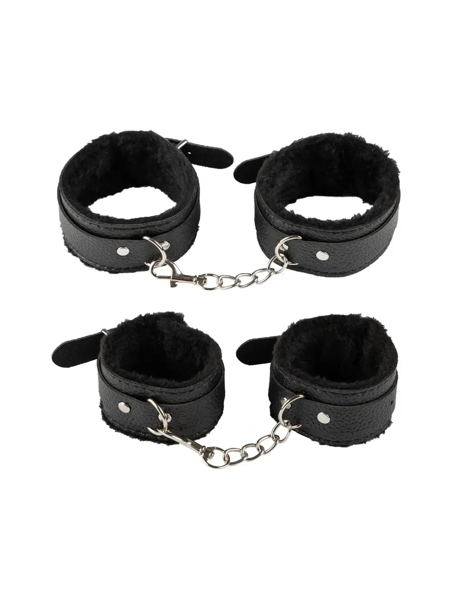 В набор входит: 2 пары кожанных наручников с мехом (для рук и ног), 1 ошейник кожанный с поводком, 1 кляп-шар, 1 маска для глаз, 1 плеть-флогер, 1 веревка для связывания. 7 предметов.