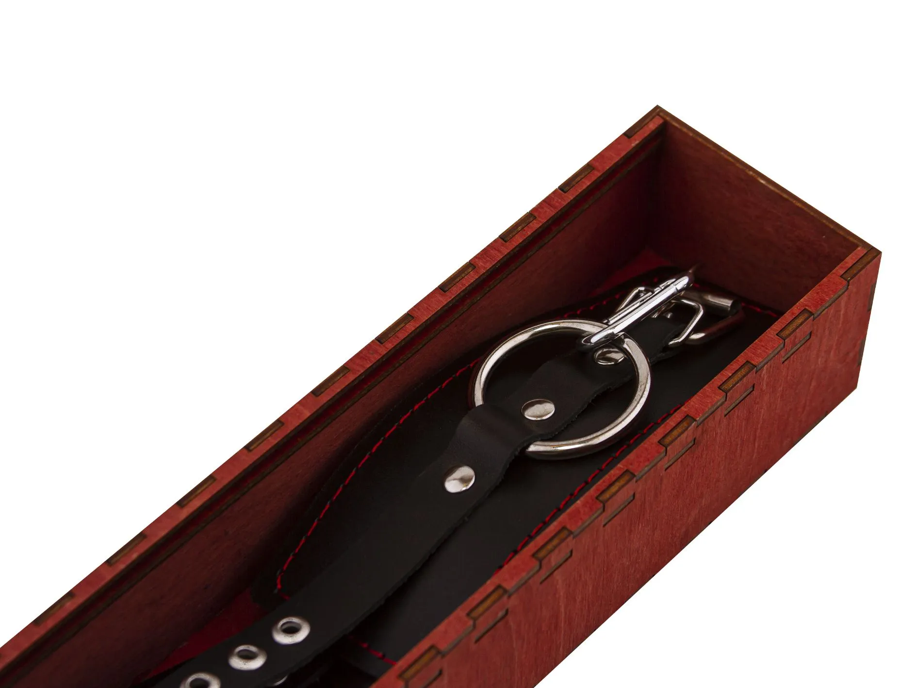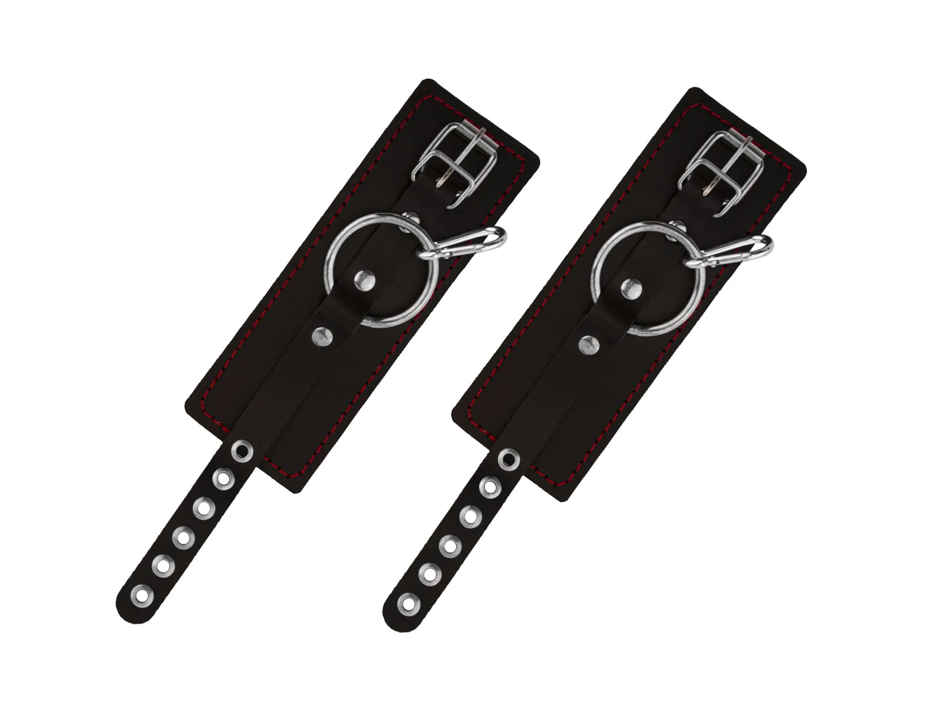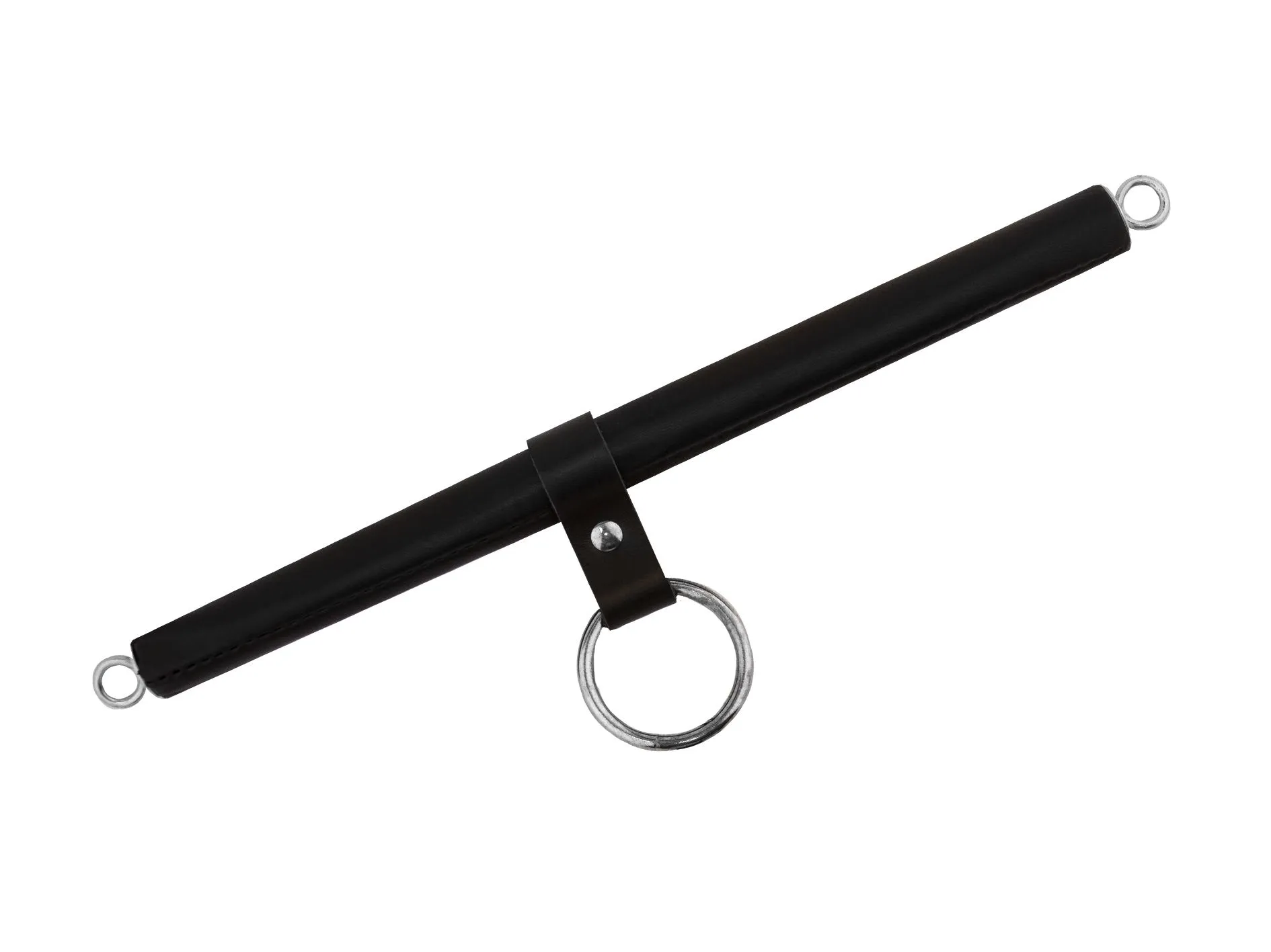 Распорка выполнена из дерева и обтянута натуральной кожей. Однослойные наручники также выполнены из натуральной кожи черного цвета и декорированы контрастной строчкой.