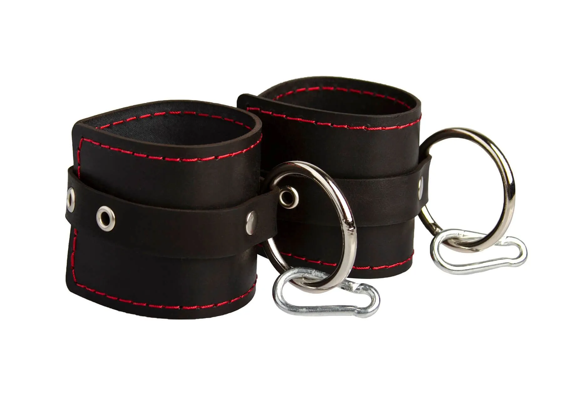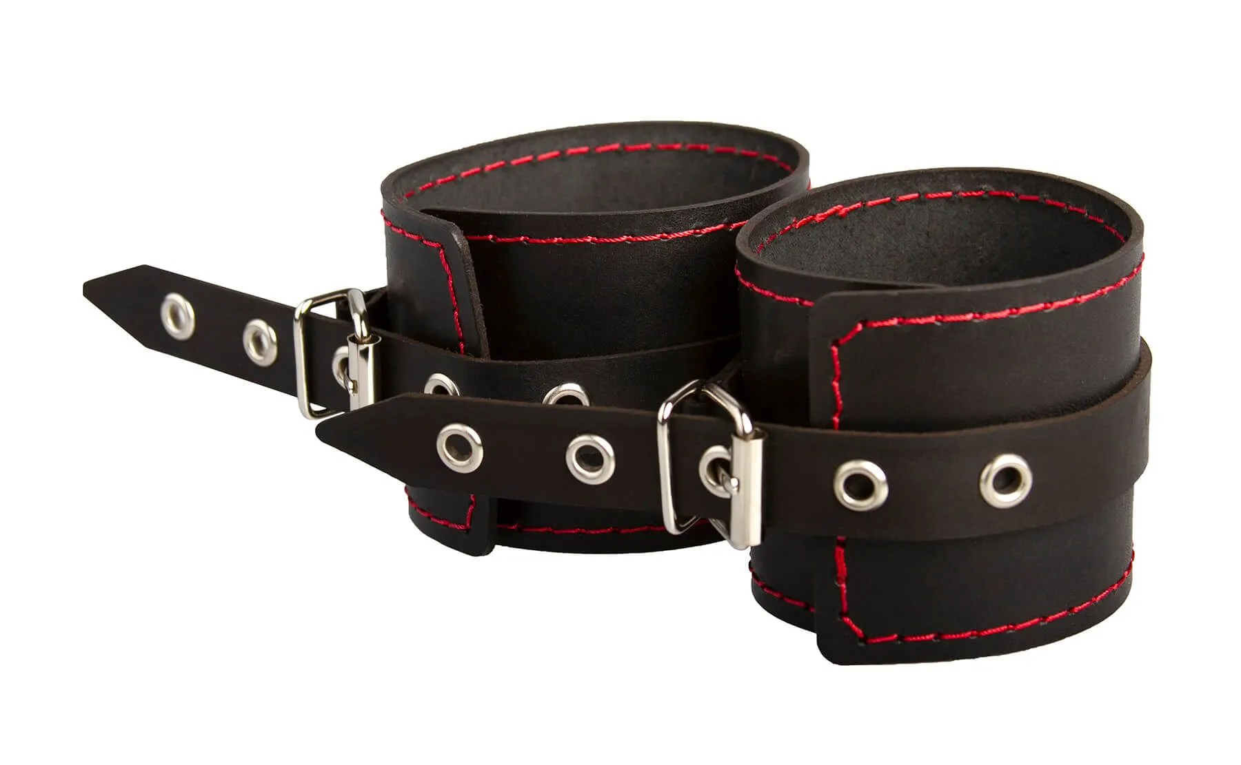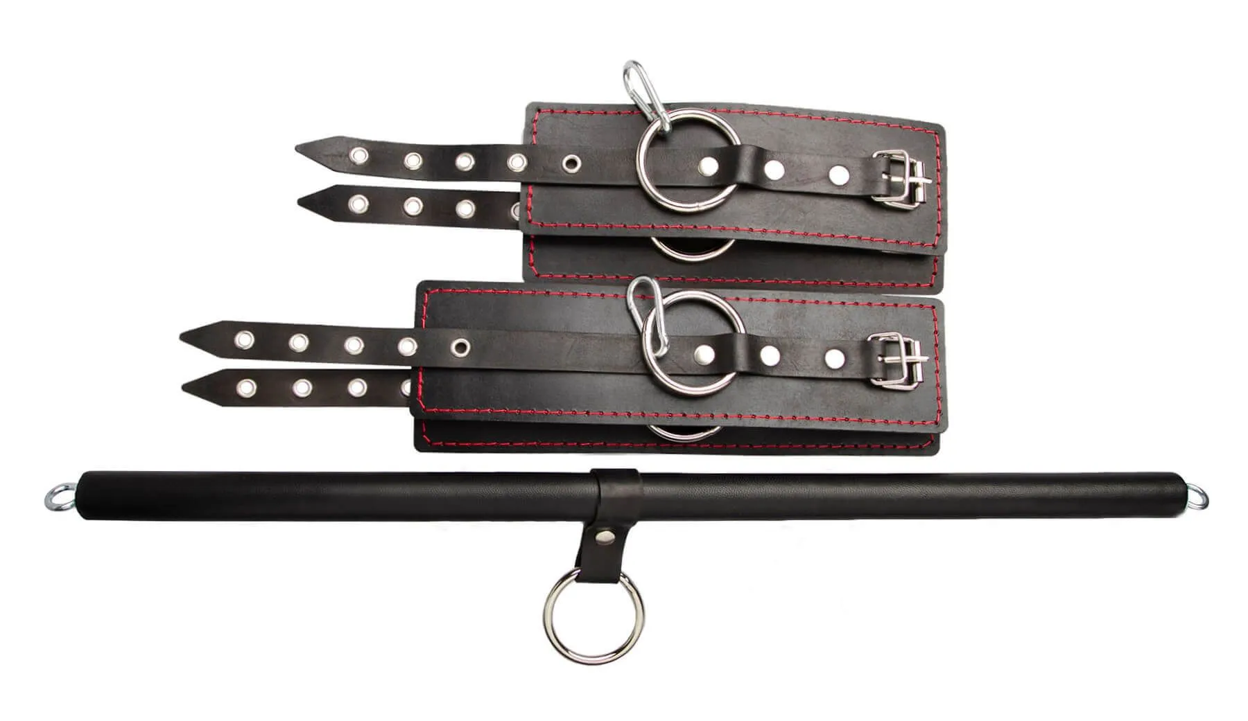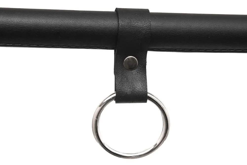 Распорка выполнена из дерева и обтянута натуральной кожей. Однослойные наручники и оковы также выполнены из натуральной кожи черного цвета и декорированы контрастной строчкой.