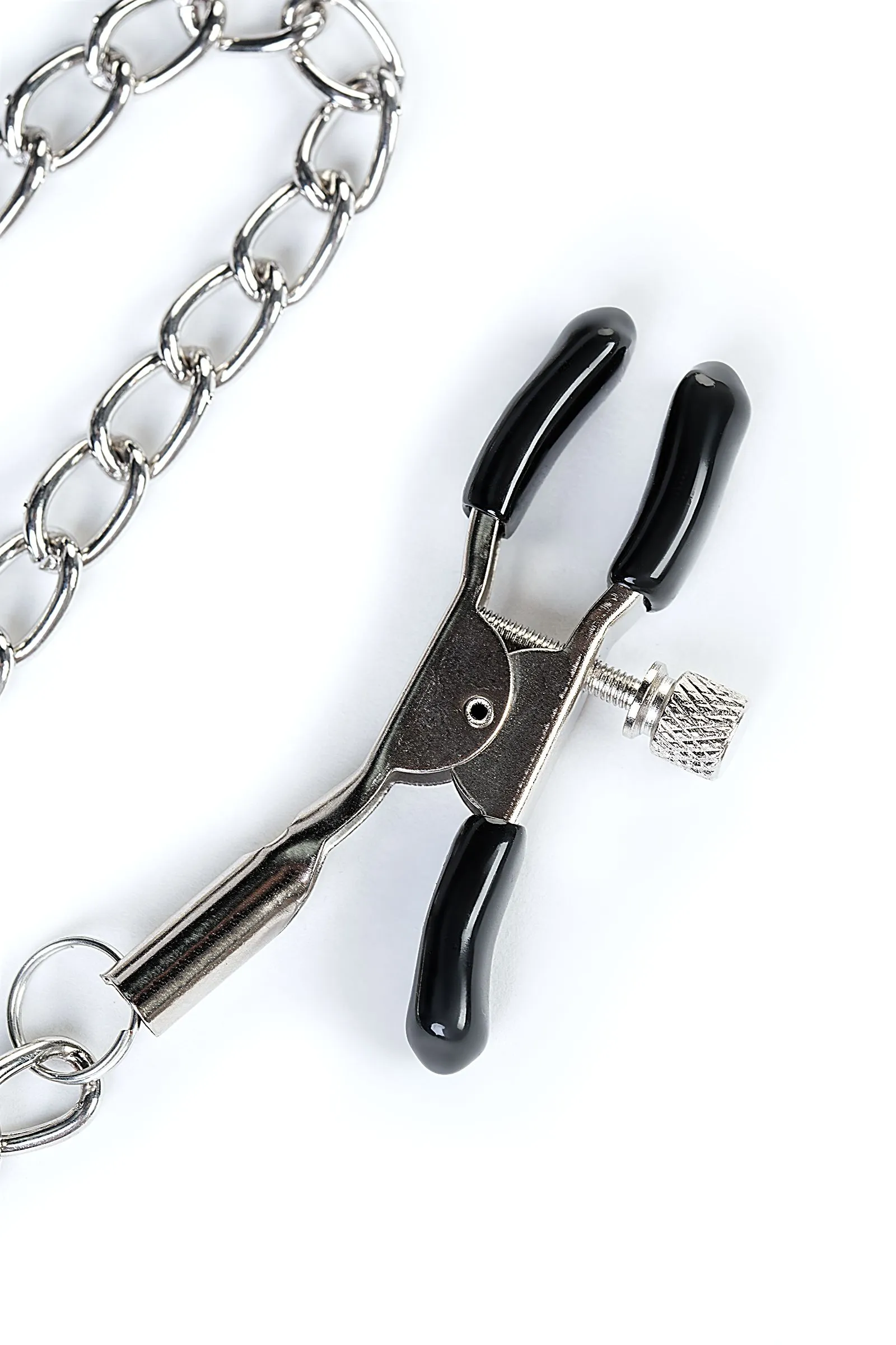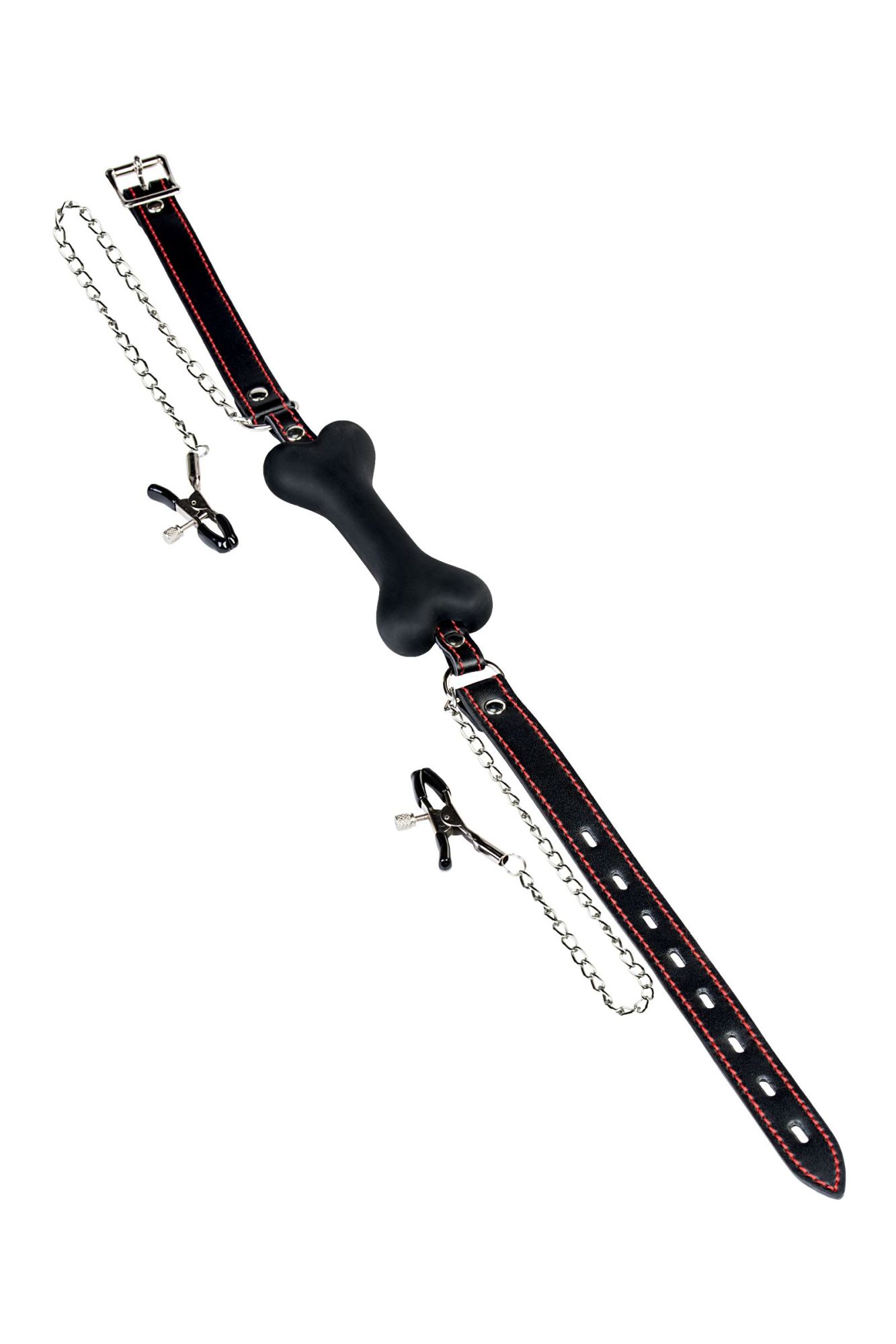 Силиконовый кляп-трензель на ремешке из PU-кожи лишает возможности разговаривать, при этом его комфортно прикусывать. Дополнительно стимулировать нижнего можно изменяя степень давления на соски зажимами-крокодилами.