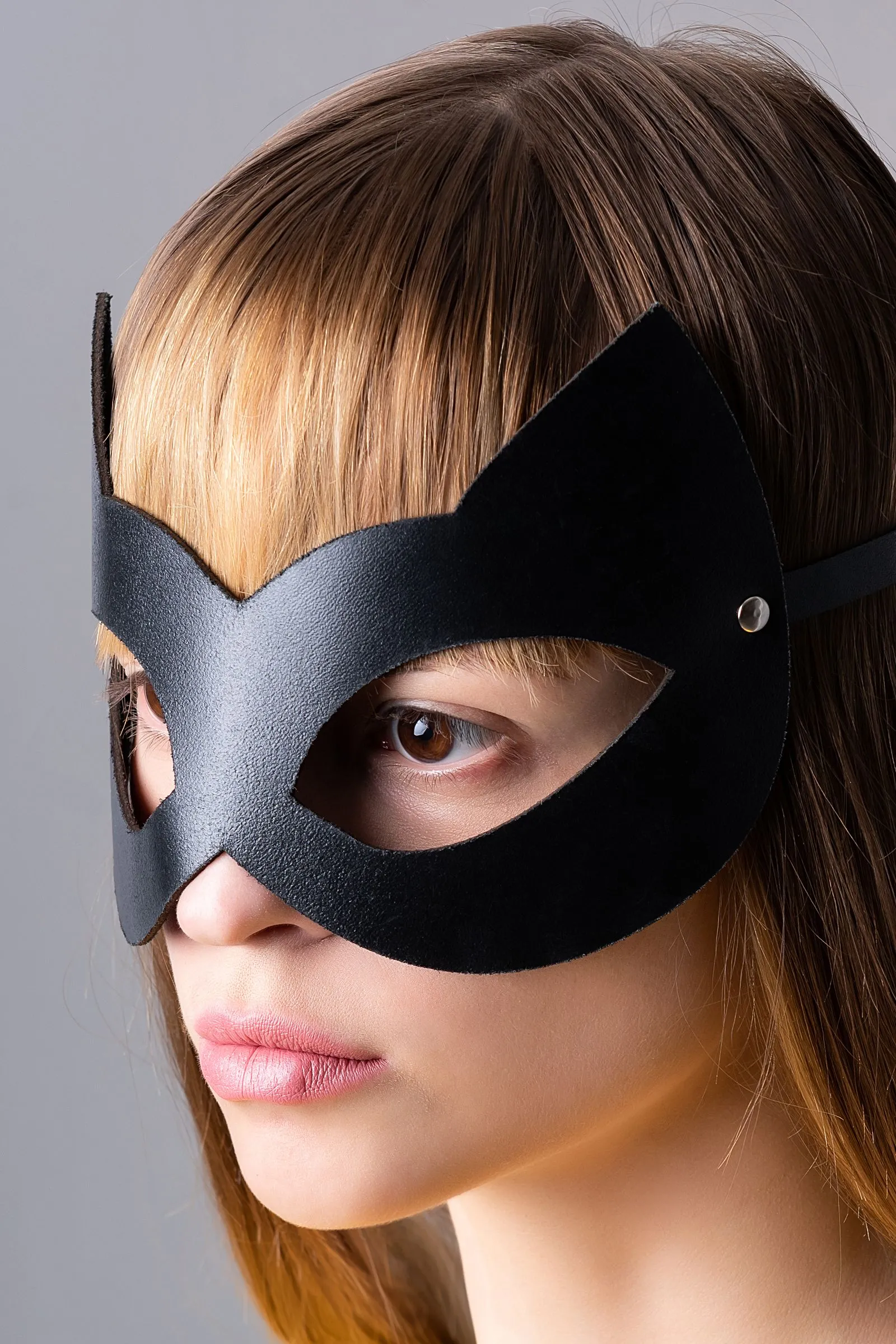Маска «Кошка» «Штучки-Дрючки» Кожаная маска «Кошка» от бренда «Штучки-Дрючки» — это аксессуар, который должен быть в коллекции каждой ценительницы удовольствий, ведь с ее помощью можно: Исследовать себя Ограничение зрения позволяет полностью сосредоточиться на ощущениях и обостряет тактильное восприятие. В маске привычные прикосновения, поцелуи или тиклинг раскрываются целой гаммой новых чувств. Играть в подчинение Вжиться в роль послушной «пленницы» или насладиться тотальным контролем над чувствами партнера — с маской «Кошка» можно переписать сценарий прямо во время игры. Экспериментировать Надевай маску только на время прелюдии, чтобы усилить возбуждение, или под конец игры, чтобы сделать финал фееричным. Попробуй все виды удовольствия с кожаной маской «Кошка» от «Штучки-Дрючки»