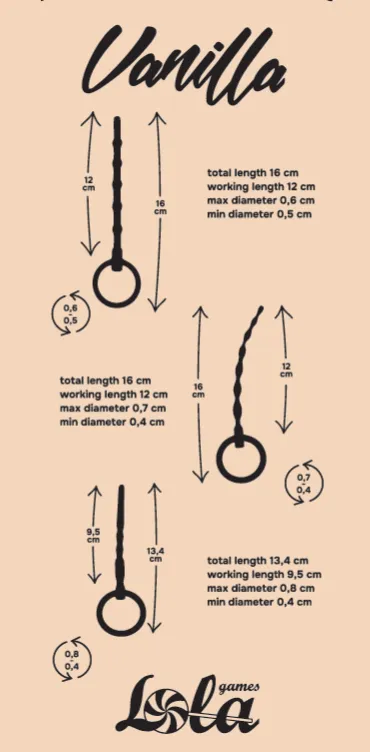 Набор идеальных уретральных стимуляторов из медицинского силикона создан для любителей ярких ощущений и незабываемого опыта. Рельефная поверхность массажеров мягко расширяет уретру, доставляя максимальное удовольствие поклонникам CBT-игр. Важно помнить, что уретральные стимуляторы не рекомендуется вводить глубже основания полового члена, а перед использованием следует проконсультироваться со специалистом. Стимуляторы различаются по размерам: первый имеет общую длину 16 см, рабочую длину 12 см, максимальный диаметр 0,6 см и минимальный 0,5 см. Второй – общая длина 16 см, рабочая длина 12 см, максимальный диаметр 0,7 см, минимальный 0,4 см. Третий – общая длина 13,4 см, рабочая длина 9,5 см, максимальный диаметр 0,8 см, минимальный 0,4 см.