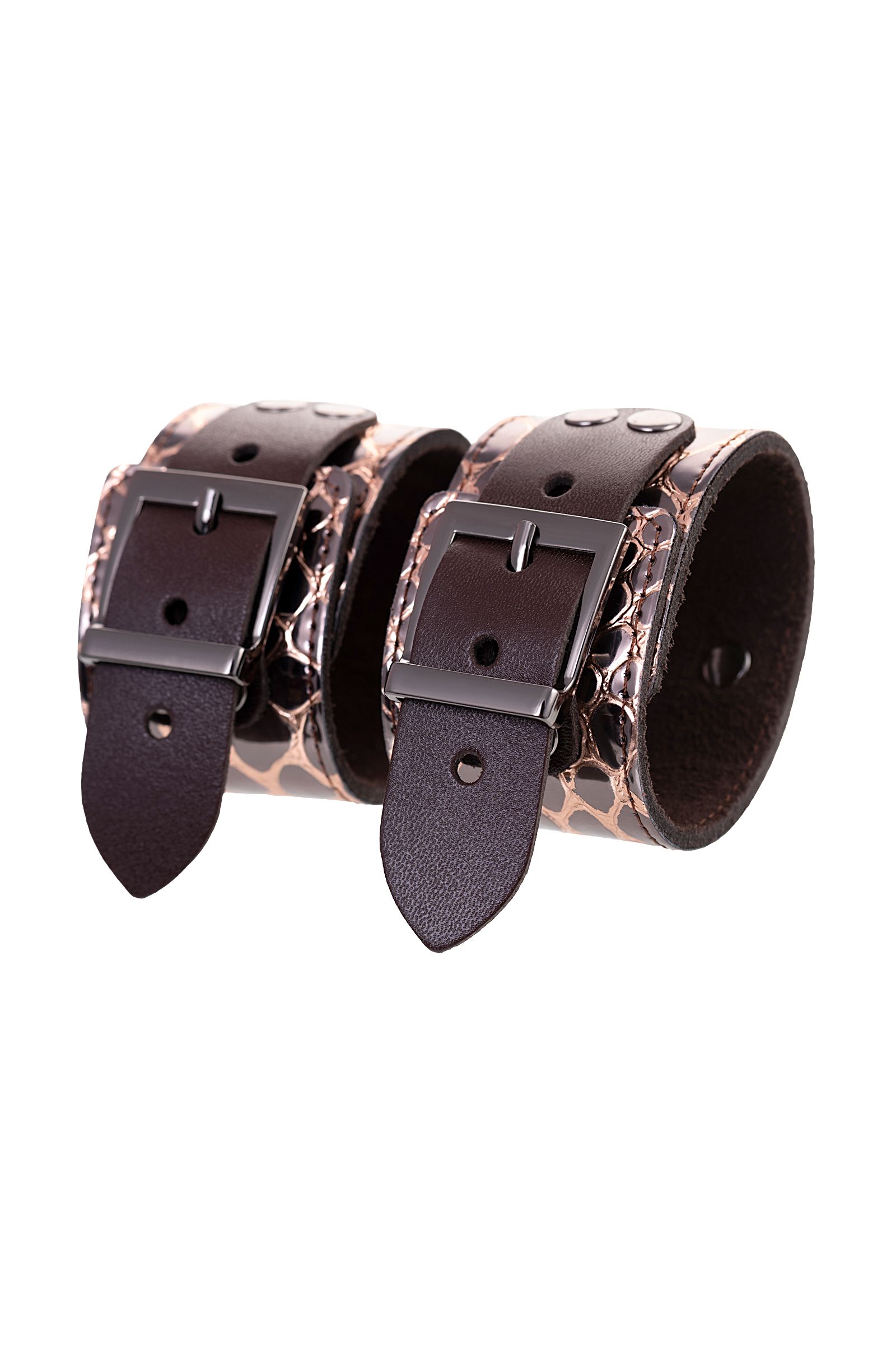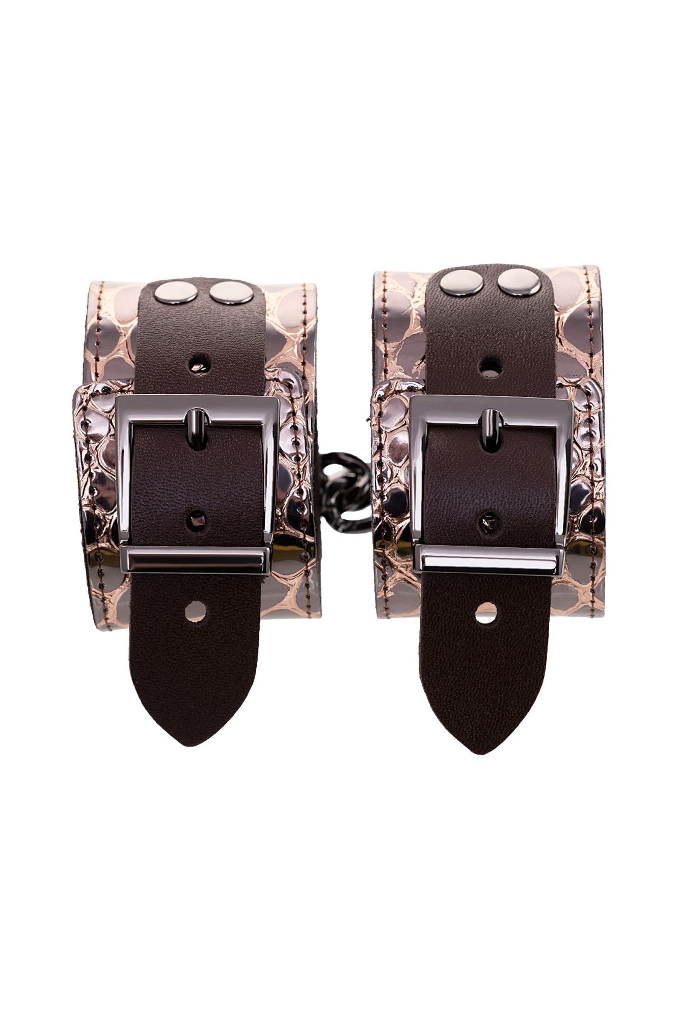 Наручники изготовлены из натуральной кожи. Регулируются при помощи металлических пряжек. Наручники соединяются карабинами. Общая длина 27 см. Ширина 4,6 см. ..