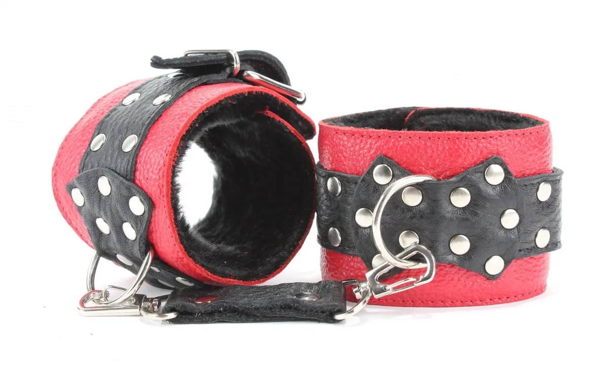 Кожаные наручники красного цвета.Ширина - 5 см. Украшены заклепками и соединяются между собой цепью с карабинами (длина цепочки - 15,5 см) Размер наручников регулируется при помощи застежки