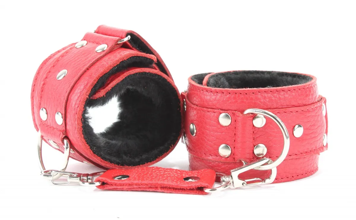 Кожаные наручники красного цвета. Ширина - 5 см. Украшены заклепками и соединяются между собой цепью с карабинами. Внутренняя часть наручников отделана черны мехом. Размер наручников регулируется при помощи застежки-липучки