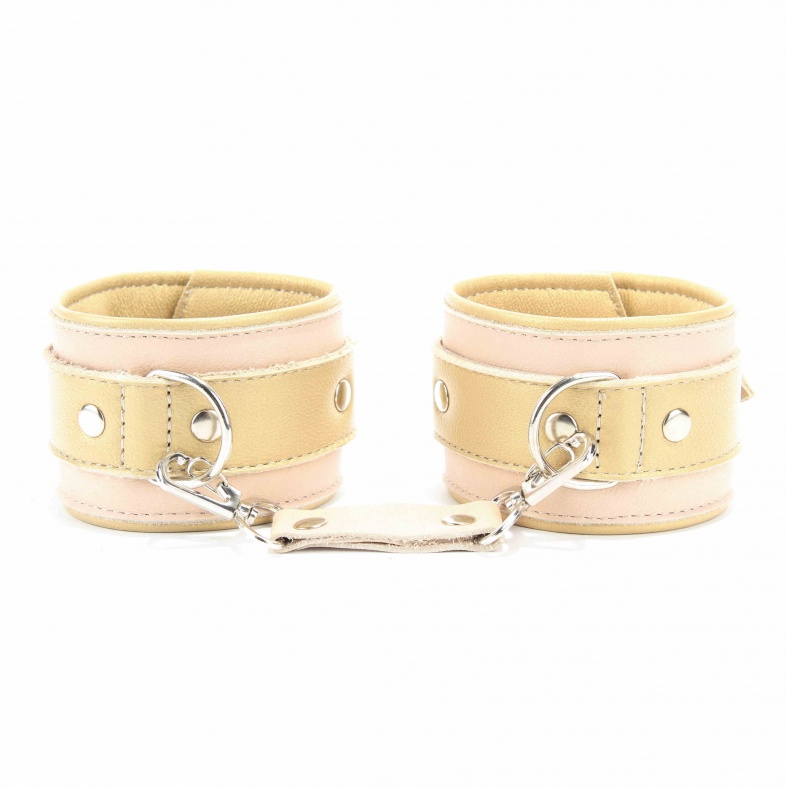 Наручники из натуральной кожи бежевого цвета с золотистойй отделкой из нежной перчаточной кожи. Сварная металлическая фурнитура и цельный хлястик для надежной фиксации. Ширина - 6 см.,Не нарушают кровообращение, надёжно фиксируются на запястьях с помощью ремешков. Размер универсальный, регулируемый.