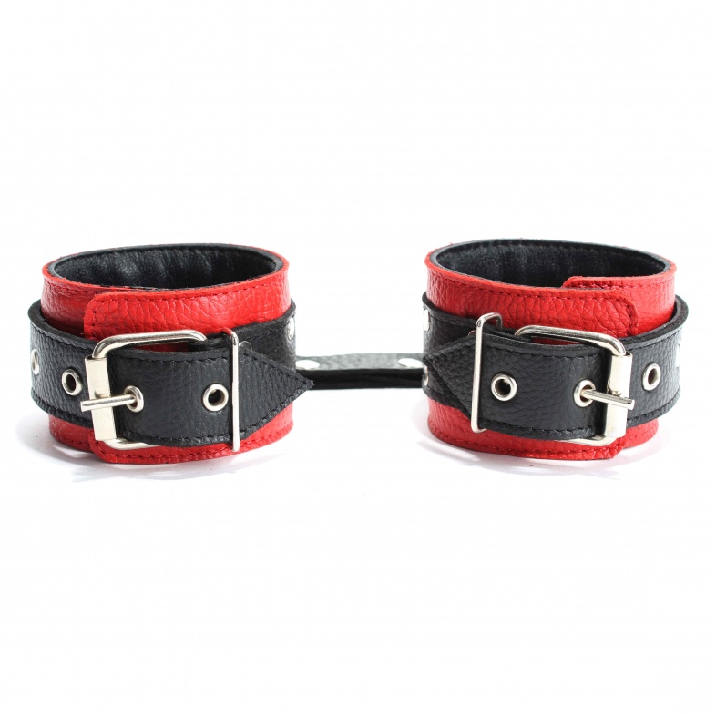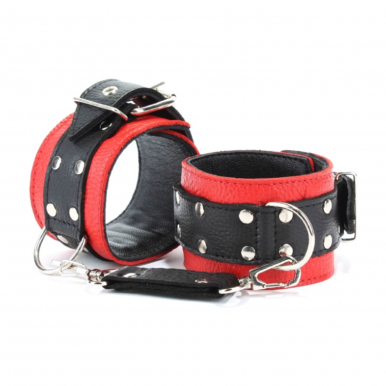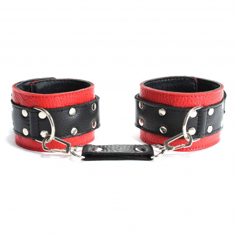 Кожаные наручники в красно-черной гамме.Ширина - 5 см. Украшены заклепками и соединяются между собой цепью с карабинами (длина цепочки - 15,5 см) Размер наручников регулируется при помощи застежки.