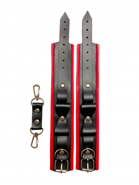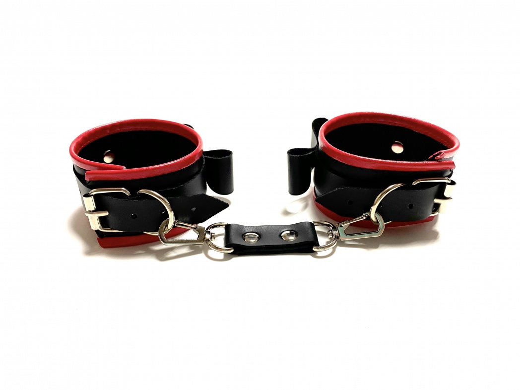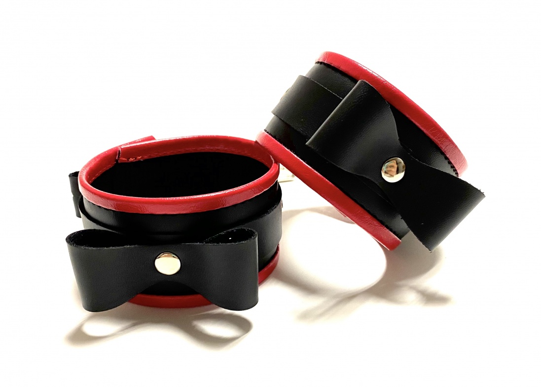 Красивые и функциональные наручники, выполненные из искусственной кожи. Декорированы металлической фурнитурой, лаковыми бантиками и красными вставками по краям. Обхват удобно регулируется с помощью пряжек. Ширина наручников 4,5см, общая длина наручника вместе с ремешком 30см. В комплекте идет соединение с карабинами, общая длина соединения 11см. Очень экономичный, экологичный и практически незаменимый аксессуар для вашей любовной игры! Материал: эко-кожа, металл Цвет: черный, красный