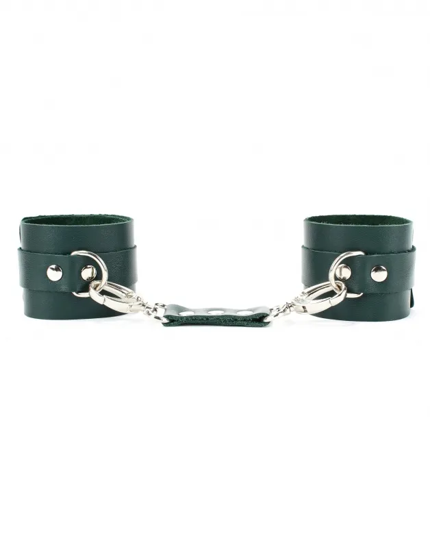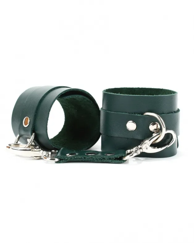 Оковы выполнены из натуральной кожи изумрудного цвета. Металлическая пряжка крепко удерживает в подчинении, кожаное соединение на карабинах фиксирует наручники вместе, ремни позволяю выбрать нужный размер. Стильный аксессуар поможет воплотить эротические фантазии в реальность.