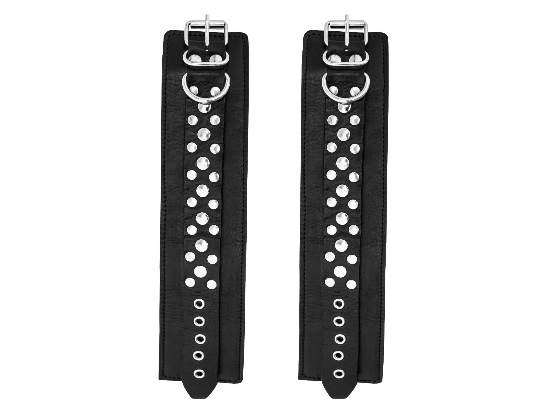 Они не нарушают кровообращение, просты в применении и обеспечивают надежную фиксацию. Данная модель изготовлена из натуральной кожи черного цвета с геометрическим рисунком из двух видов заклепок. Наручники оснащены удобным фиксирующим ремешком, позволяющим регулировать размер наручника. Мягкая подкладка (пена) обеспечит комфорт и безопасность.