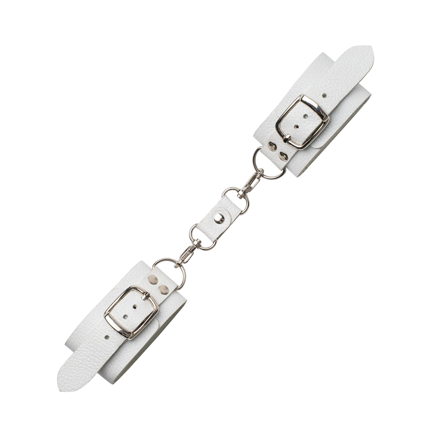 Наручники сделаны из натуральной кожи белого цвета и соединены между собой при помощи кожаной стяжки с карабинами. Такой аксессуар позволит Вам обездвижить руки своего партнера, лишив его возможности сопротивляться и препятствовать Вашим ласкам. Невозможность двигать руками обострит все чувства партнера, делая его особенно чувствительным ко всем прикосновениям. Наручники разнообразят Ваши интимные игры и позволят испытать новые ощущения во время секса.