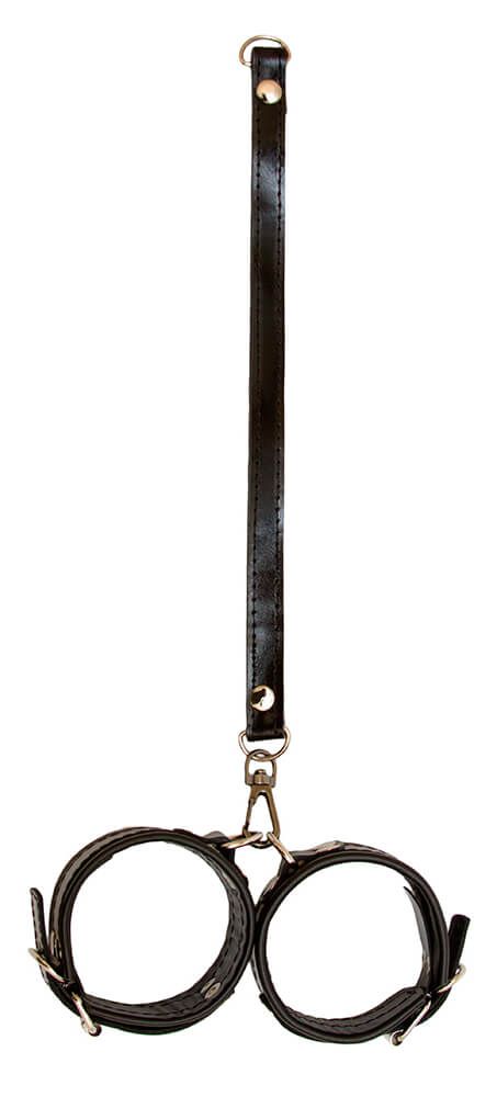 Наручники присоединены при помощи карабина к кожаной петле. Наручники можно регулировать по размеру.