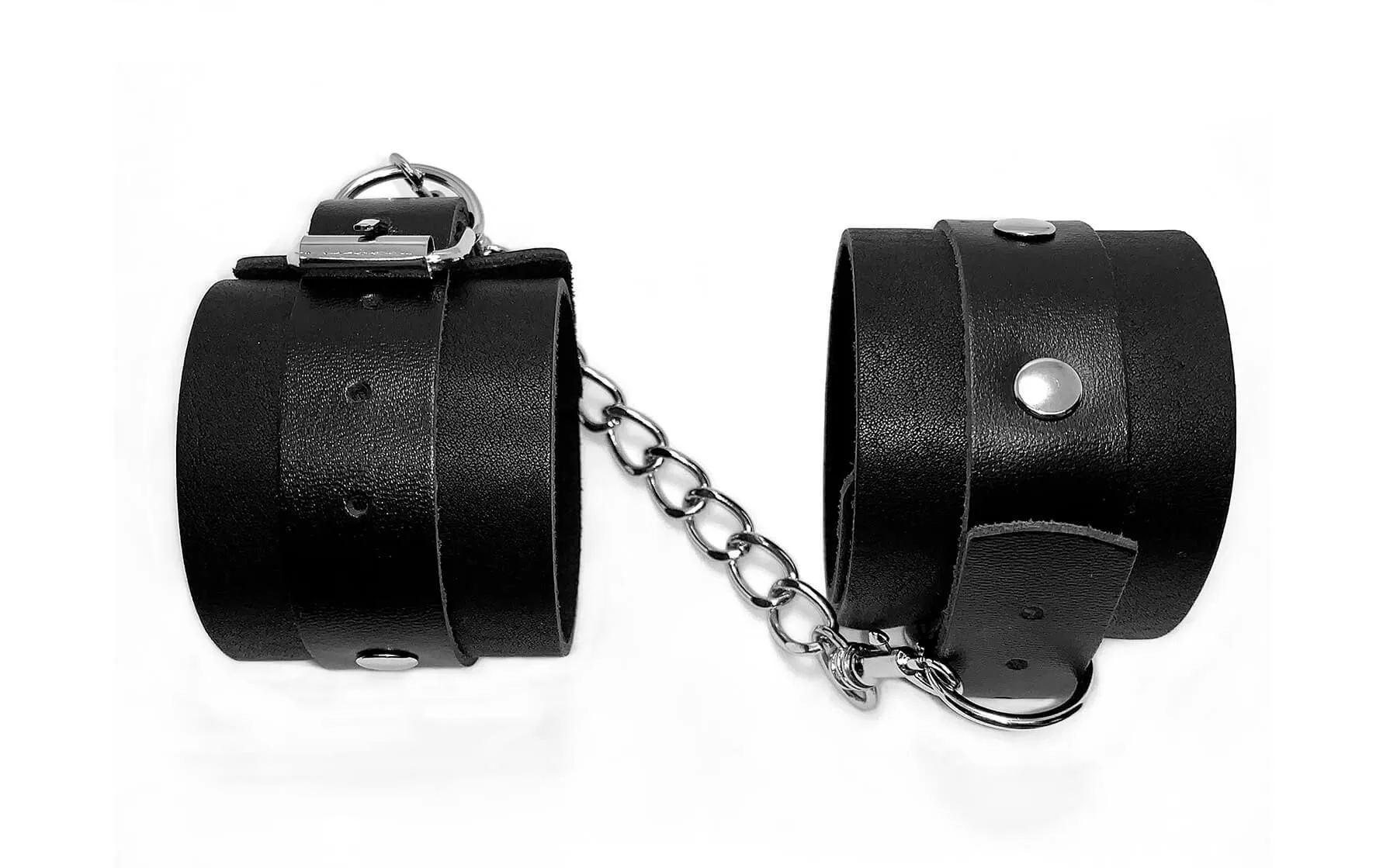 У данной модели есть дополнительная пряжечка, позволяющая затягивать размер наручников до минимума. Наручники соединены между собой прочными карабинами с металлической цепью длиной 12 см.