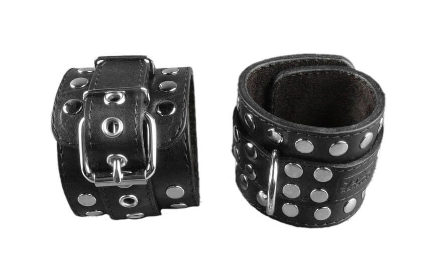 Наручники сделаны из натуральной кожи черного цвета, подшиты велюром и декорированы металлическими клепками по краю. Без соединительной фиксации. Регулируются по размеру.