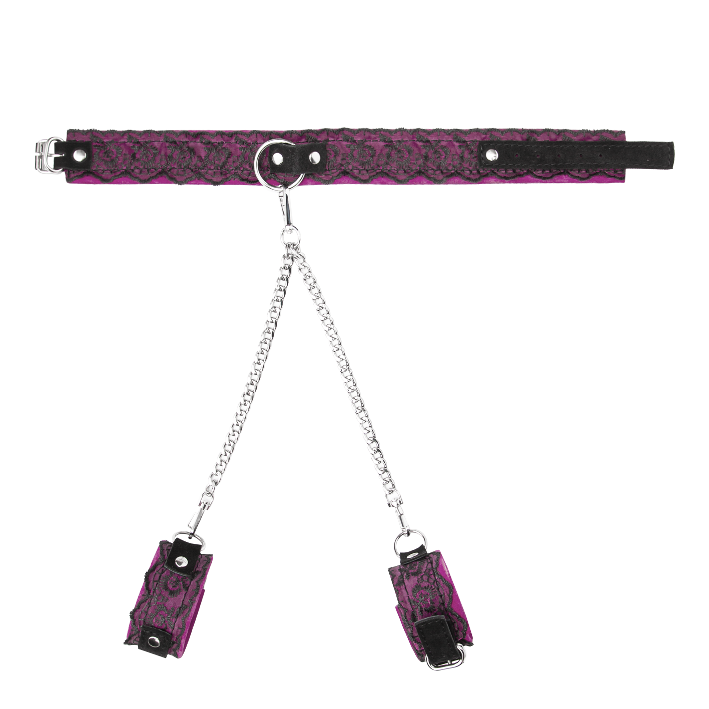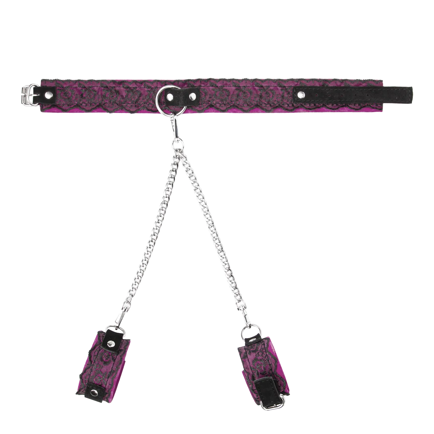 Между собой наручники и ошейник соединяются стяжкой с двумя цепочками. Размер регулируется при помощи ремешков с пряжками.