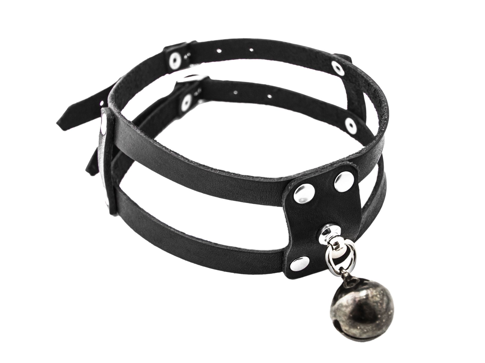 Ошейник из черной натуральной кожи черного цвета. Выполнен из двух тонких полос кожи и украшен колокольчиком. Две небольшие застежки - пряжки позволяют регулировать размер.