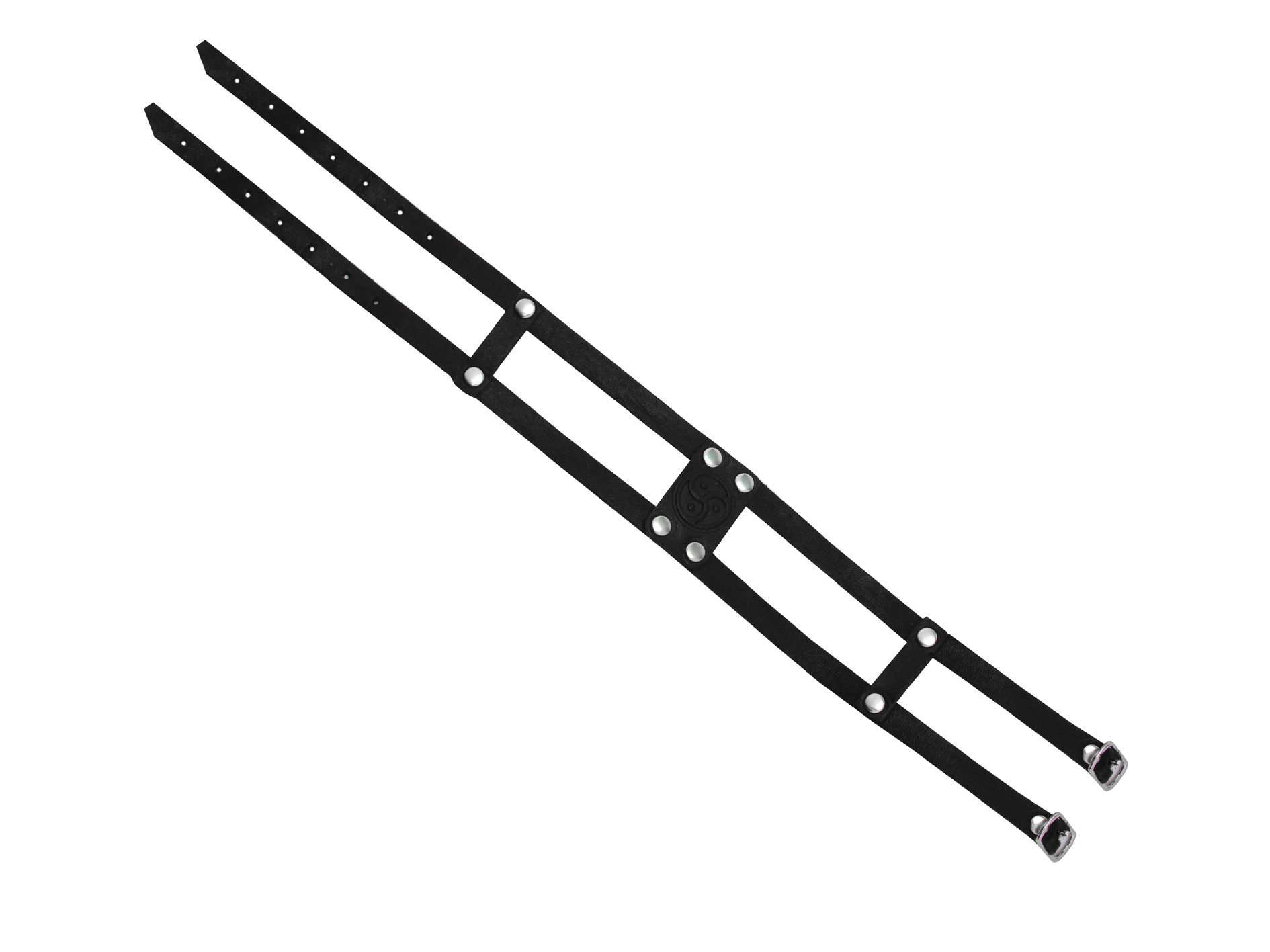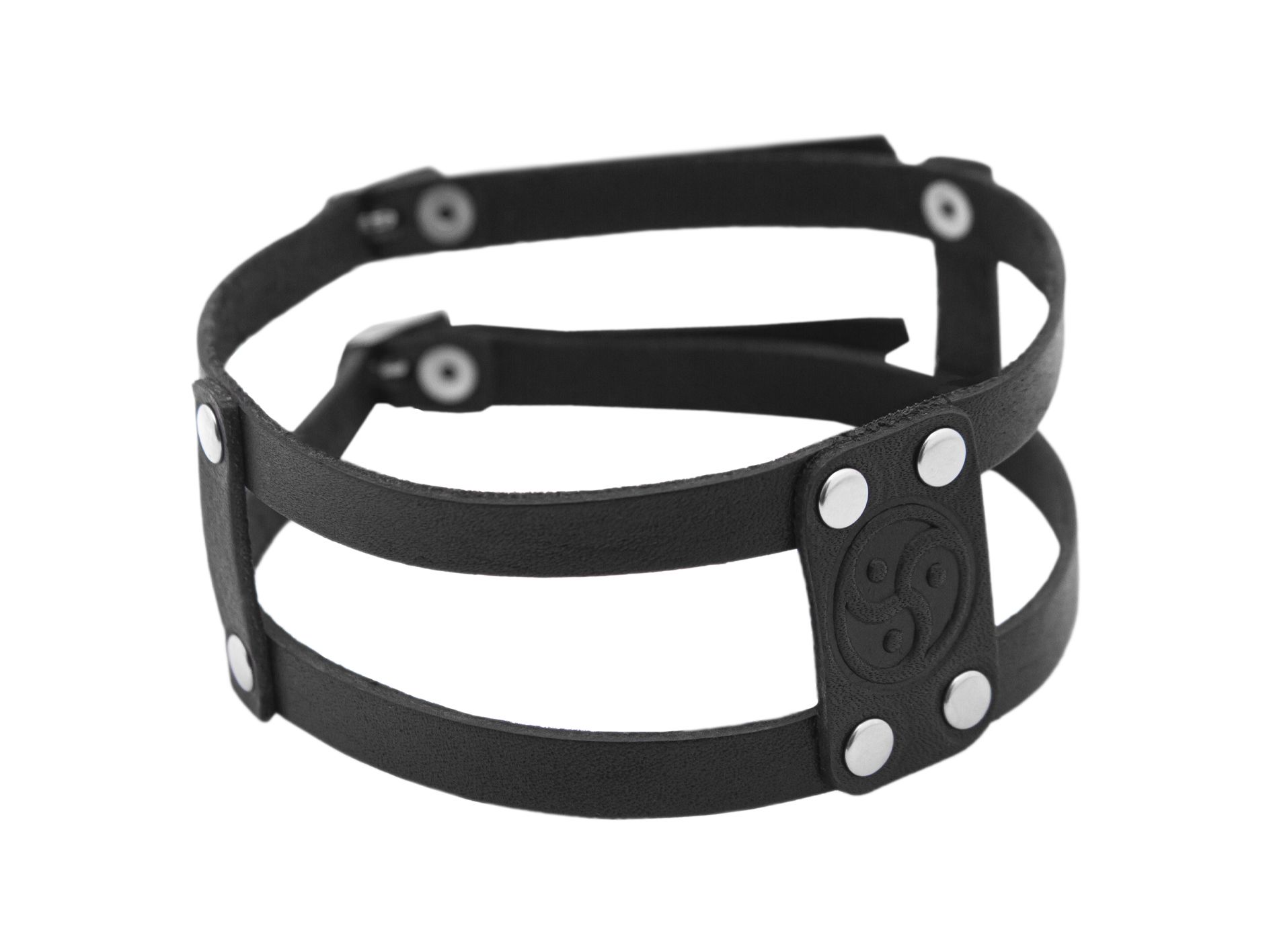 Ошейник выполнен из натуральной черной кожи. Размер универсальный, регулируется двумя застежками пряжками из никелированной стали. Ширина ошейника - 4см, вставка "Трискель" - 2,5см * 4см.