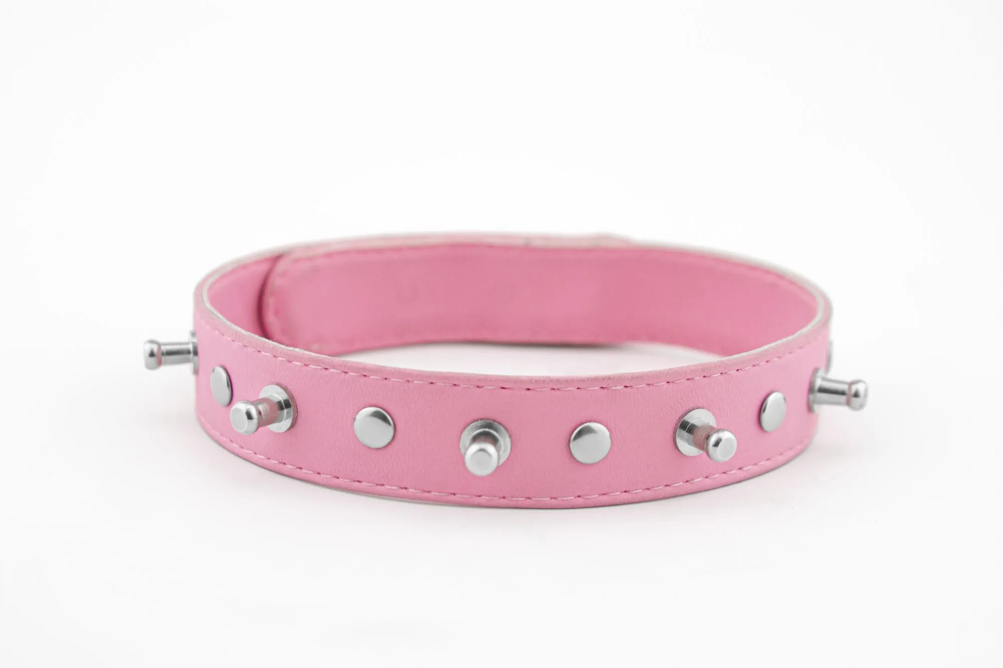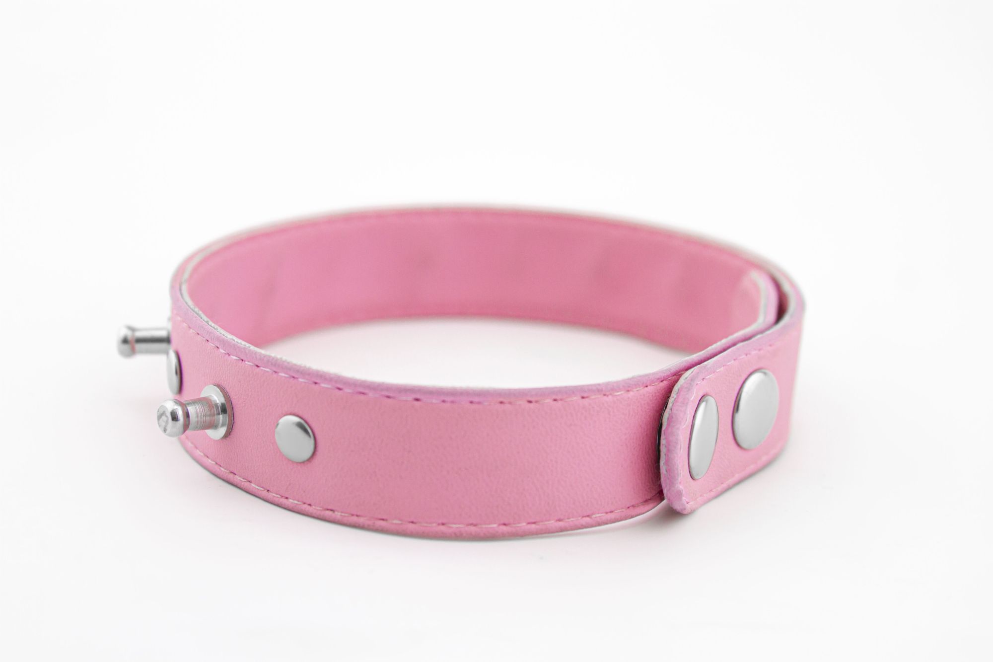 Изготовлен ошейник из искусственной кожи розового цвета, и декорирован никелированными элементами. На ошейнике имеется несколько кнопок, которые позволяют подогнать его под необходимый размер. Ширина ошейника 20 мм.
