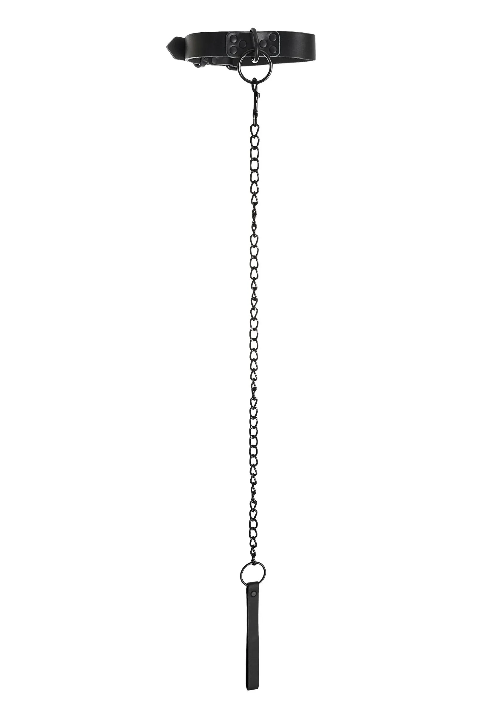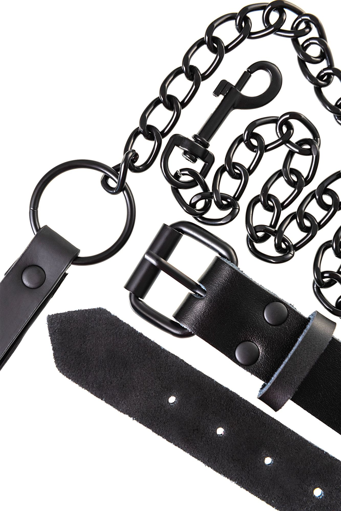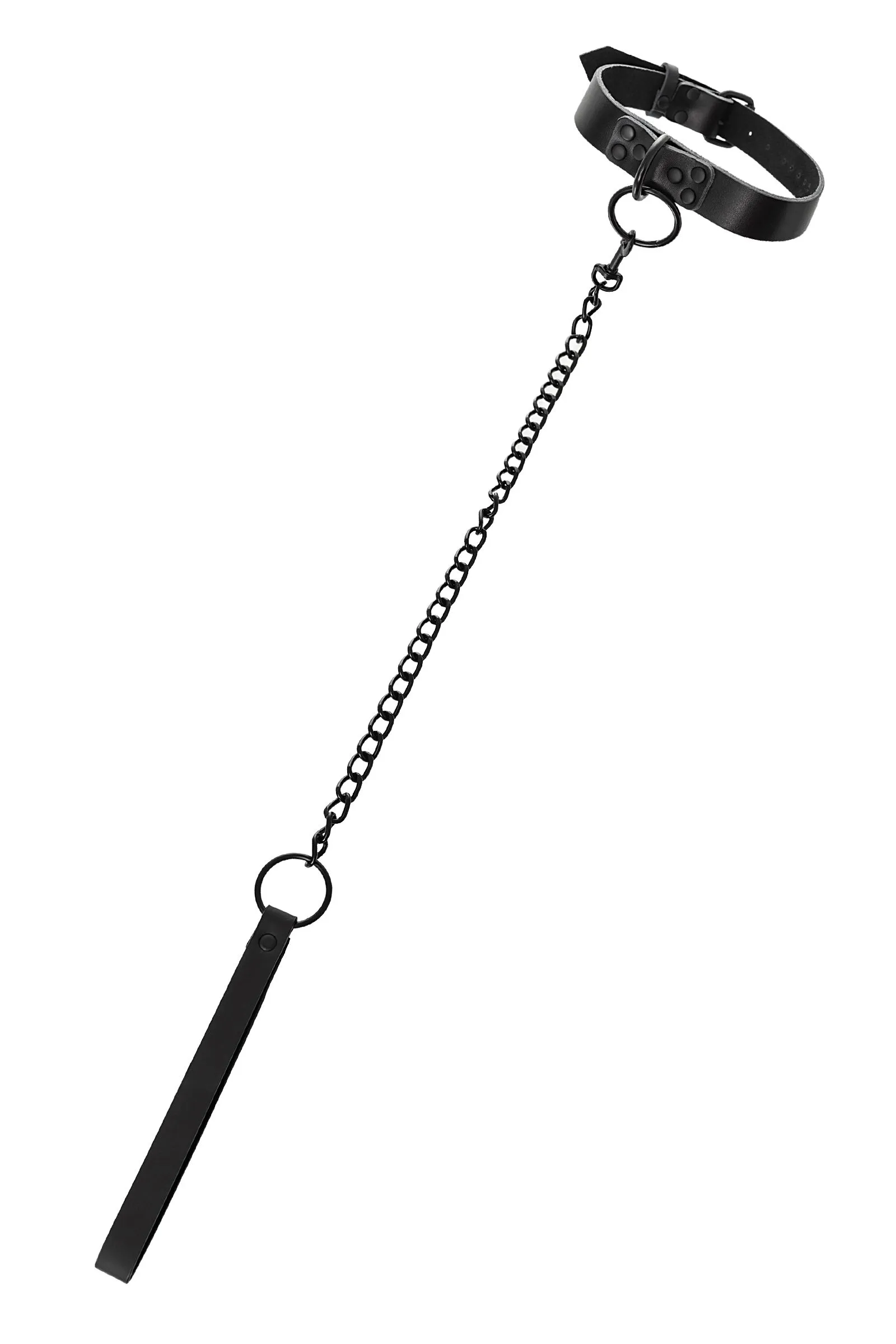 Кожаный ошейник с поводком В черной-черной комнате, в черном-черном ошейнике… Этот ошейник из черной кожи с черной же цепочкой-поводком нельзя назвать просто ограничителем свободы. Вся металлическая фурнитура выдержана в стиле строгого подчинения, не отвлекая внимание от игрового процесса. Он станет для вас стильным аксессуаром и дополнит любой образ. В нем придется следовать за Господином, но это будет очень элегантно! Благодаря универсальным цвету и форме, он подойдет партнеру любого пола, размер регулируется пряжкой. Поводок имеет ручку из кожи, крепится к кольцу ошейника карабином. Длина ошейника 58 см Ширина ошейника 2,5 см Длина поводка 79 см В фотосессии на модели использованы пэстис Theatre 705006