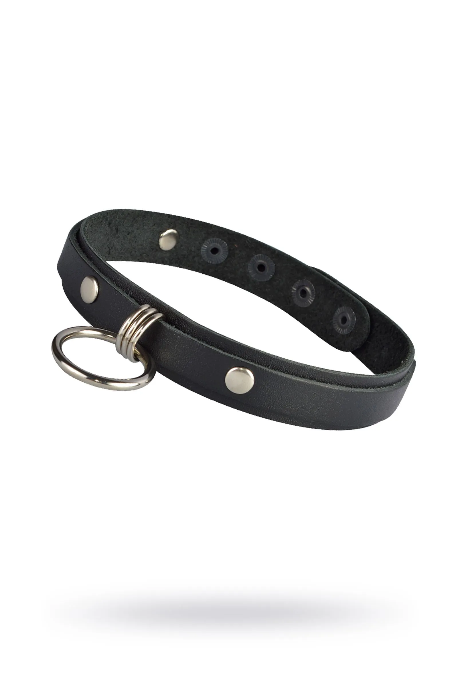 Стильный чокер изготовлен из натуральной кожи чорного цвета и декорирован металлическим кольцом диаметром 3,3 см. Длина чокера 41 см, ширина - 2 см. Вся металлическая фурнитура имеет никелевое покрытие. Регулируется при помощи кнопок.