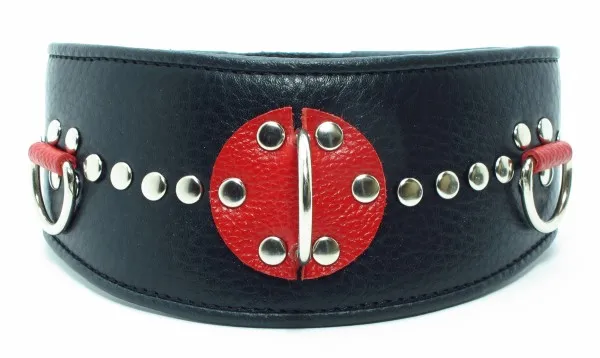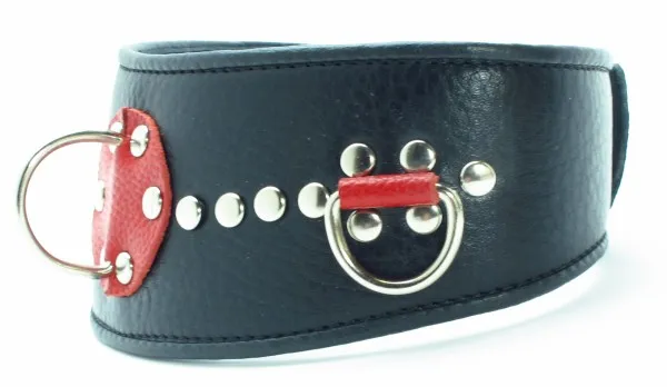 Ошейник с расширением впереди выполнен из качественной натуральной черной кожи, мягкий и комфортный в использовании. На изделии находятся три сварных полукольца. Аксессуар декорирован металлическими заклепками и вставками из красной кожи, ширина в самом широком месте 6см, по краям 4см.Ошейник фиксируется металлическими кнопками, позволяющими подобрать нужный размер,подойдет на обхват шеи от 30 до 36см. Стильный аксессуар поможет воплотить эротические фантазии в реальность.