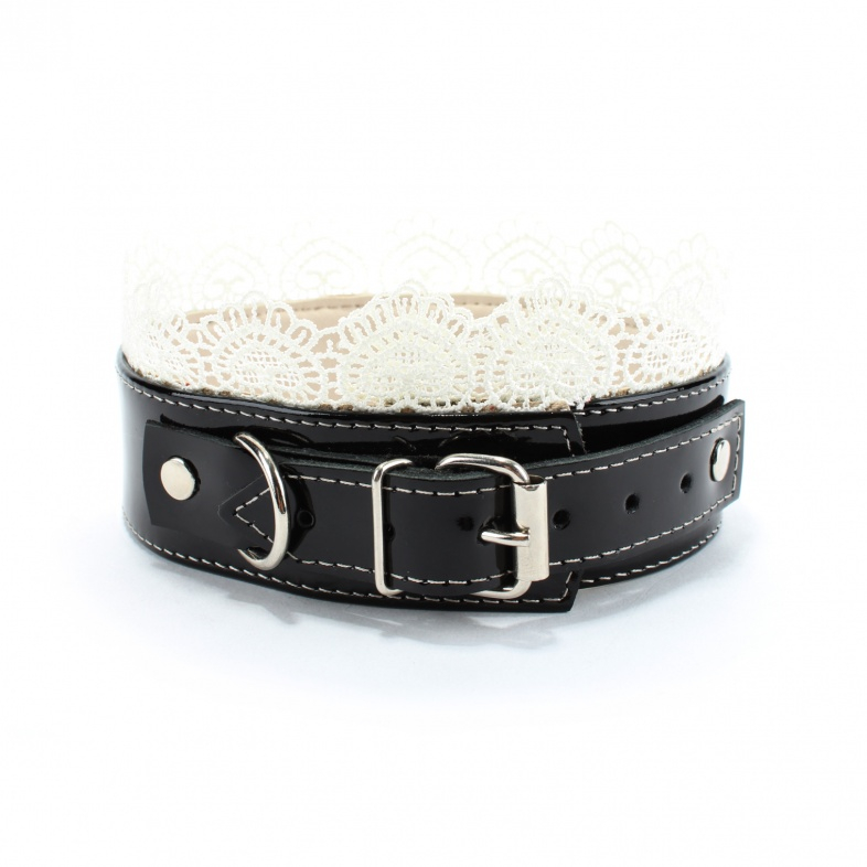 Черный ошейник с белым кружевом, изготовлен из натуральной лаковой кожи. Характеристика: длина ошейника- 41 см, ширина ошейника- 3,8 см, ширина ошейника с кружевом- 6,5 см. Имеет 6 отверстий для регулировки размера. Упаковка: картонная подложка.