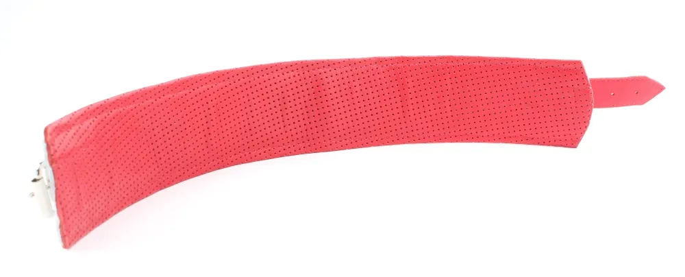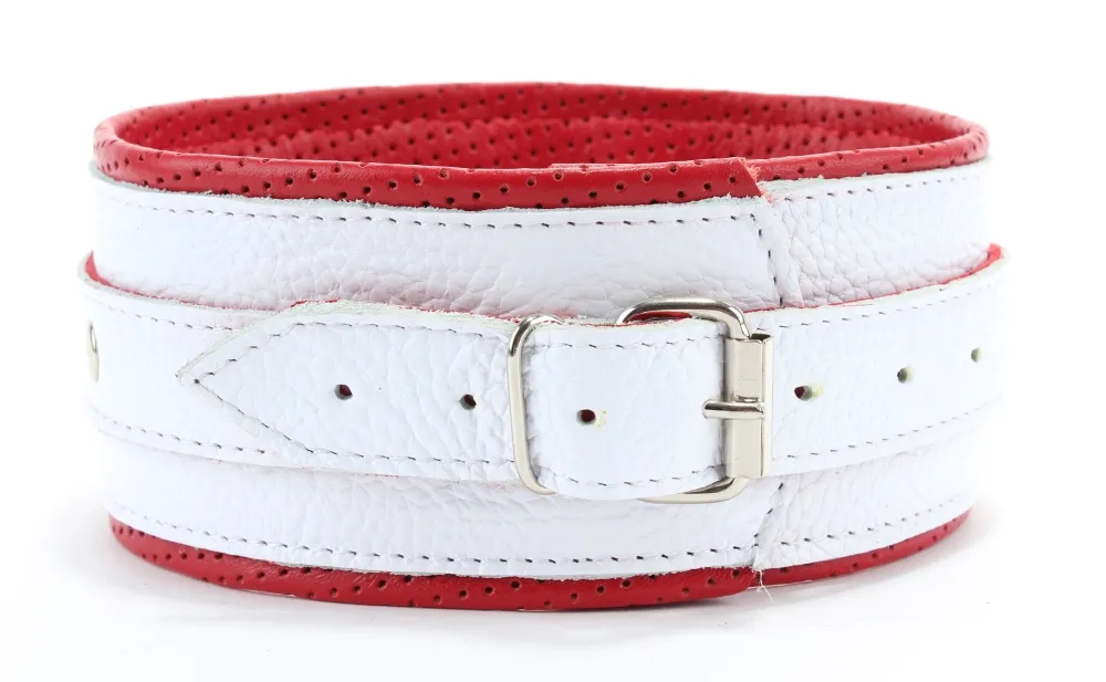 Ошейник с внешней стороны белого цвета, с внутренней-красного цвета, выполнен из высококачественной кожи. Ширина составляет 6 см. Длина-41 см. Размер регулируется застёжкой. Для крепления различных элементов бандажа, а также поводков и цепочек на БДСМ девайсе предусмотрено одно D-видное кольцо.