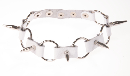 Изготовлен из натуральной кожи. При изготовлении использована никелированная фурнитура. Ширина ошейника 20 мм, длина шипов 25 мм. Размер универсальный.
