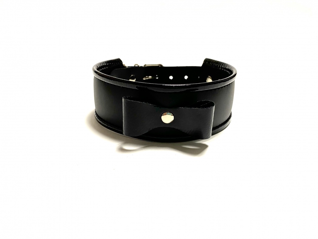 Минималистичный черный ошейник, выполненный из искусственной кожи. Аксессуар декорирован бантиком спереди и металлическим полукольцом, к которому можно пристегнуть поводок. Основная часть выполнена из матовой эко-кожи, а бант и вставки по краю - из лаковой, что придаёт ошейнику изящества. Общая длина ошейника вместе с пряжкой и ремешком 47см, ширина 4,5см.Этот ошейник может отлично дополнить образ и стать волнующим элементом любовной игры. Экономичный, экологичный и симпатичный аксессуар! Материал: эко-кожа, металл Цвет: черный