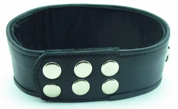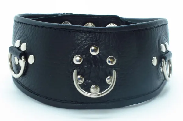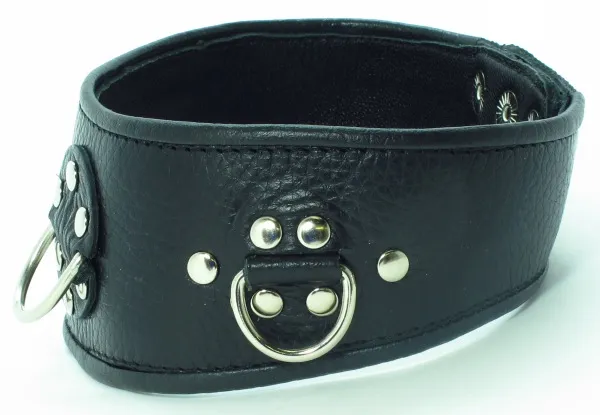 Широкий ошейник для БДСМ игр в качестве наказания за провинность. Фетиш-изделие черного цвета с хромированными заклепками, которые добавляют аксессуару дерзости. В ошейник вставлены 3 D-кольца, с ними фетиш-изделие соединяется с бандажом или поводком. Вы символически посвящаете партнера в сексуальное рабство, ведущая роль всецело принадлежит именно Вам. Характеристики ошейник кожаный с клепками: цвет – черный, материал – кожа, макс. ширина в передней части – 6 см