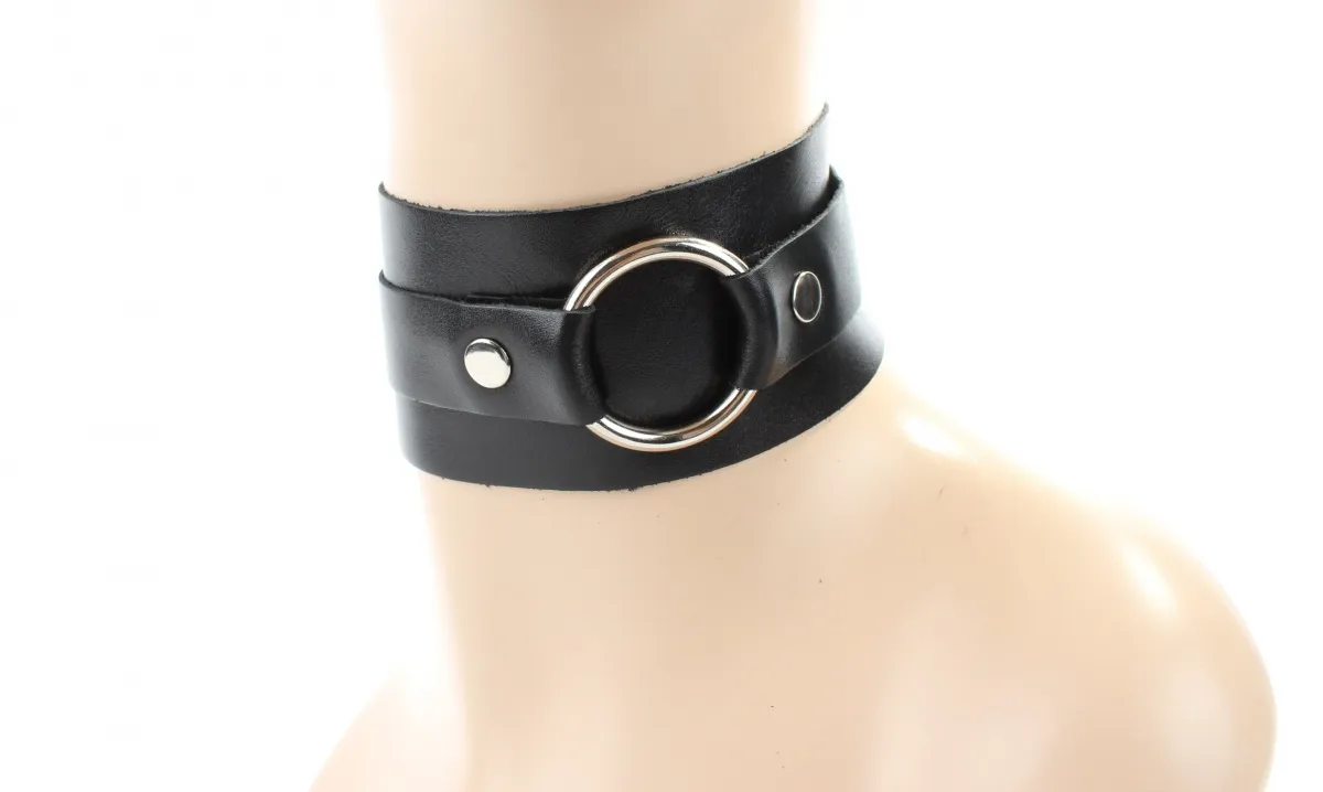 Чокер сделан из мягкой натуральной черной кожи. Впереди высокая стойка декорирована металлическим кольцом, размер чокера регулируется пряжкой сзади. Дизайн аксессуара позволяет носить его двумя сторонами, внося разнообразие в выбранный образ. Материал: натуральная кожа, металл Цвет: черный