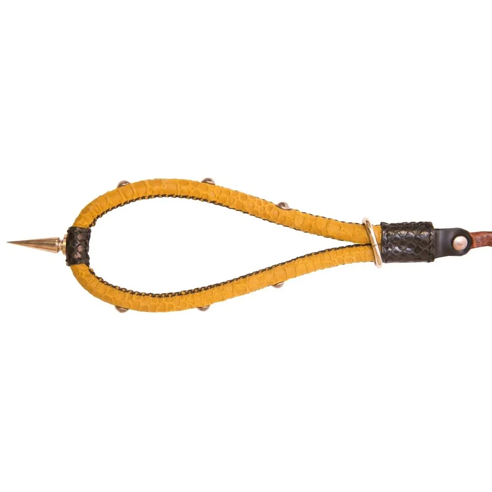 Поклонникам ролевых интимных игр придется по вкусу желтый кожаный ошейник с цепочкой-поводком. Ремешок украшен металлическими шипами и стразами в виде цветочка. Ошейник пристегивается к поводку за небольшой карабин. Изделие прекрасно подойдет для БДСМ развлечений и позволит реализовать самые нескромные сексуальные фантазии.