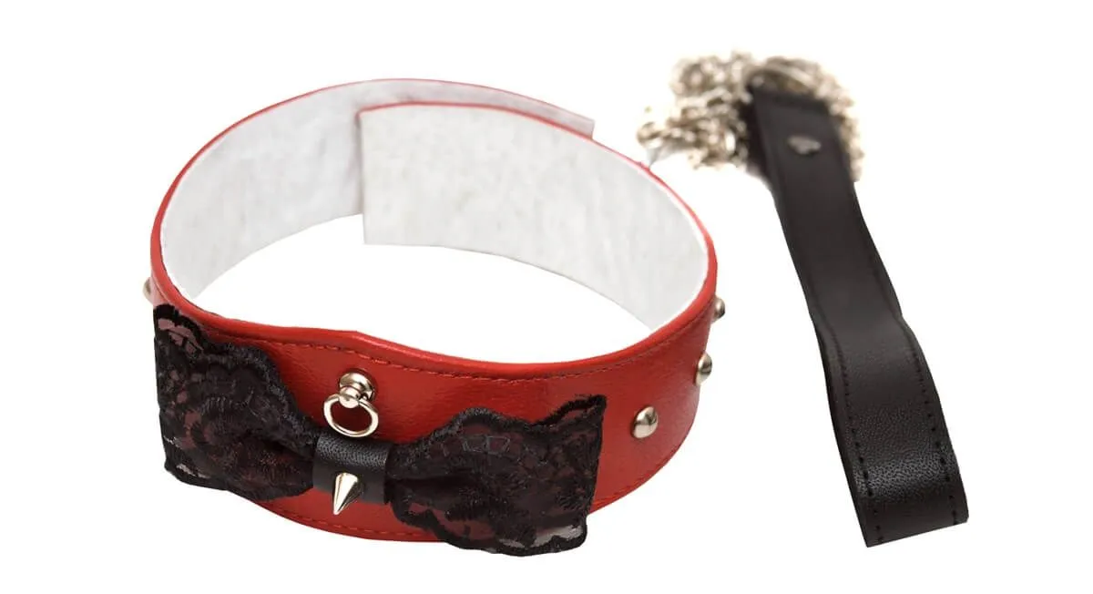 Оригинальный ошейник с бабочкой из тонкого кружева и поводком непременно понравится тем, кто желает разнообразить свои сексуальные игры. Ошейник выполнен из натуральной кожи красного цвета и декорирован металлическими заклепками. Также в комплекте есть поводок на цепочке, который пристегивается к кольцу на ошейнике при помощи карабина. Этот аксессуар позволит Вам полностью подчинить себе своего партнера. Изделие прекрасно подойдет для БДСМ развлечений и даст реализовать самые нескромные сексуальные фантазии.