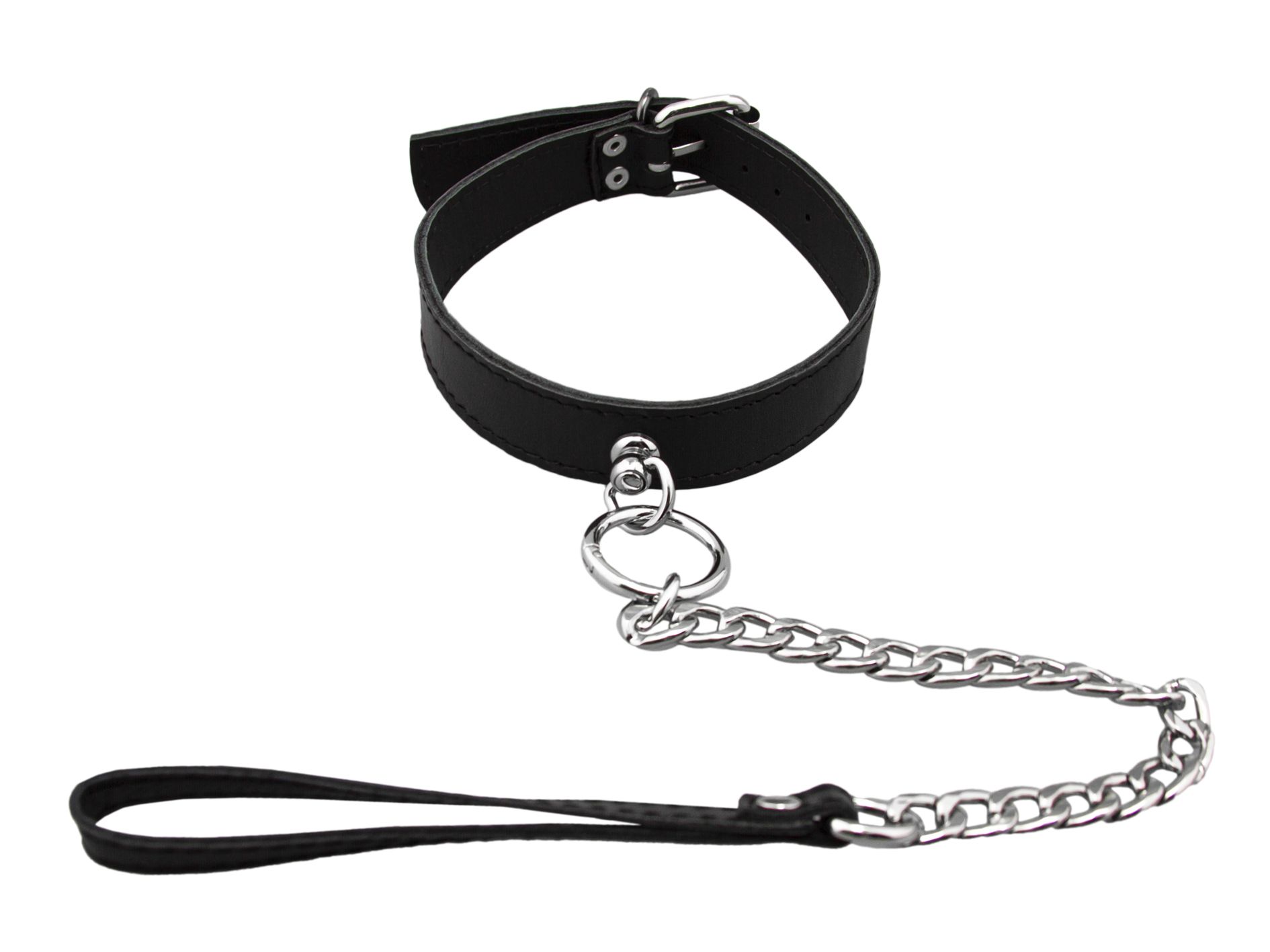Этот ошейник понравится тем, кто предпочитает игры с элементами БДСМ. Ошейник выполнен из натуральной кожи черного цвета. У него есть металлический поводо, а также удобная петелька для запястья. При помощи поводка можно будет ограничить движения партнера, одергивать его при непослушании или направлять в нужную сторону. К большому металлическому кольцу на ошейнике можно также присоединять и другие аксессуары при помощи карабина. Такой ошейник может стать как просто дерзким украшением, так и символом подчинения своему партнеру.