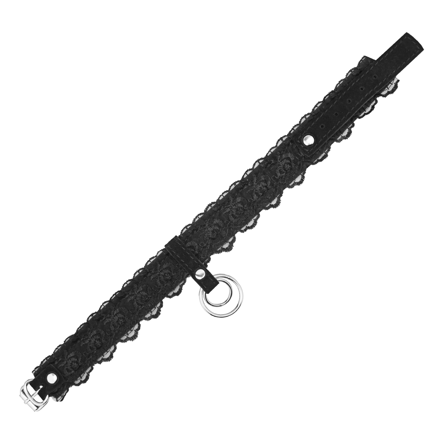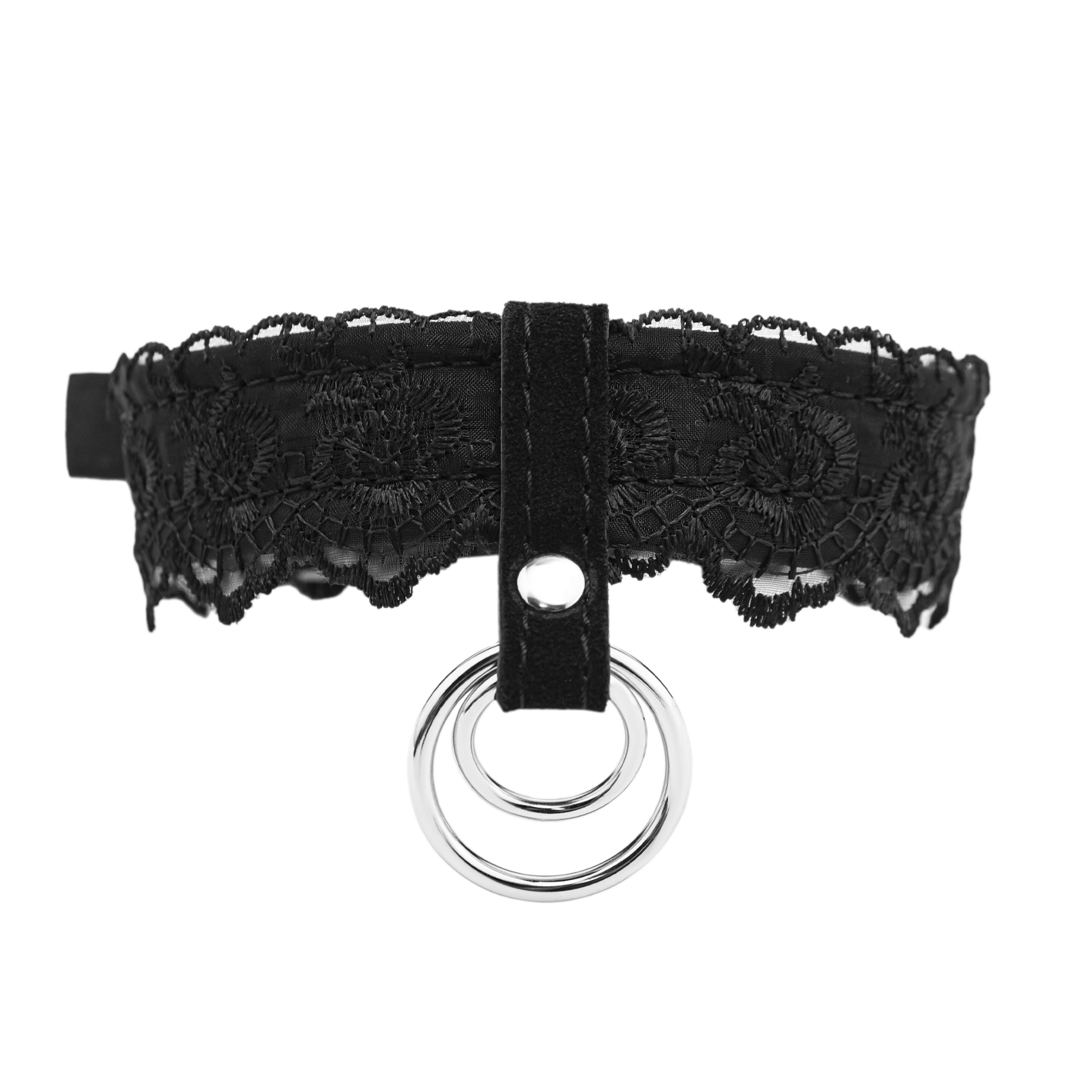 Ошейник выполнен из замши и декорирован черным кружевом. Такой аксессуар не только украсит собой шею Вашего партнера или партнерши, но и будет служить своеобразным символом подчинения. Благодаря двойному кольцу на ошейнике Вы сможете присоединить к нему поводок или другие бандажные аксессуары, чтобы поэкспериментировать с различными сценариями игры и вариантами фиксации.