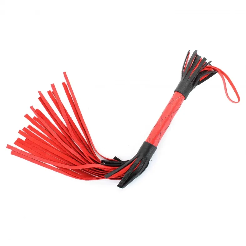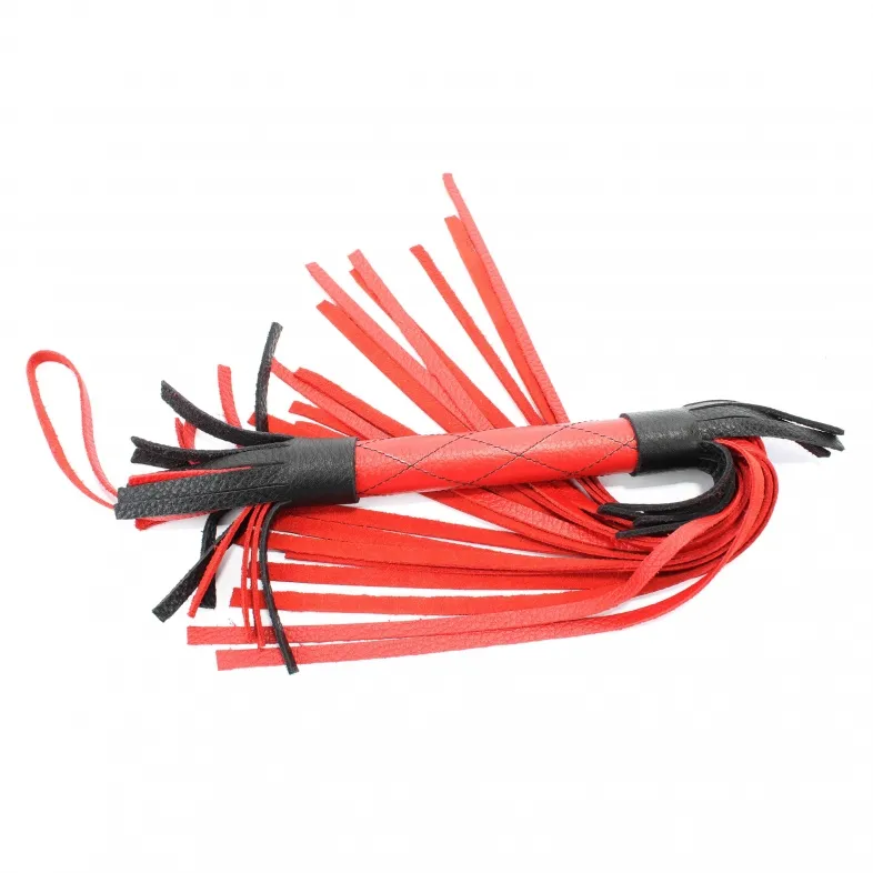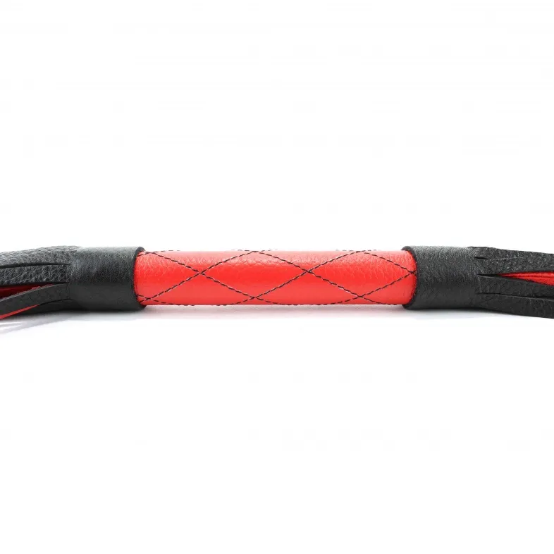 Аккуратная черно-красная плетка, изготовленная из натуральной кожи. Имеет жесткую ручку длиной 18 см, так же покрытую кожей. Имеется петля для удобного использования плети. Длина хлыстов - 27 см. Общая длина плети - 51 см.