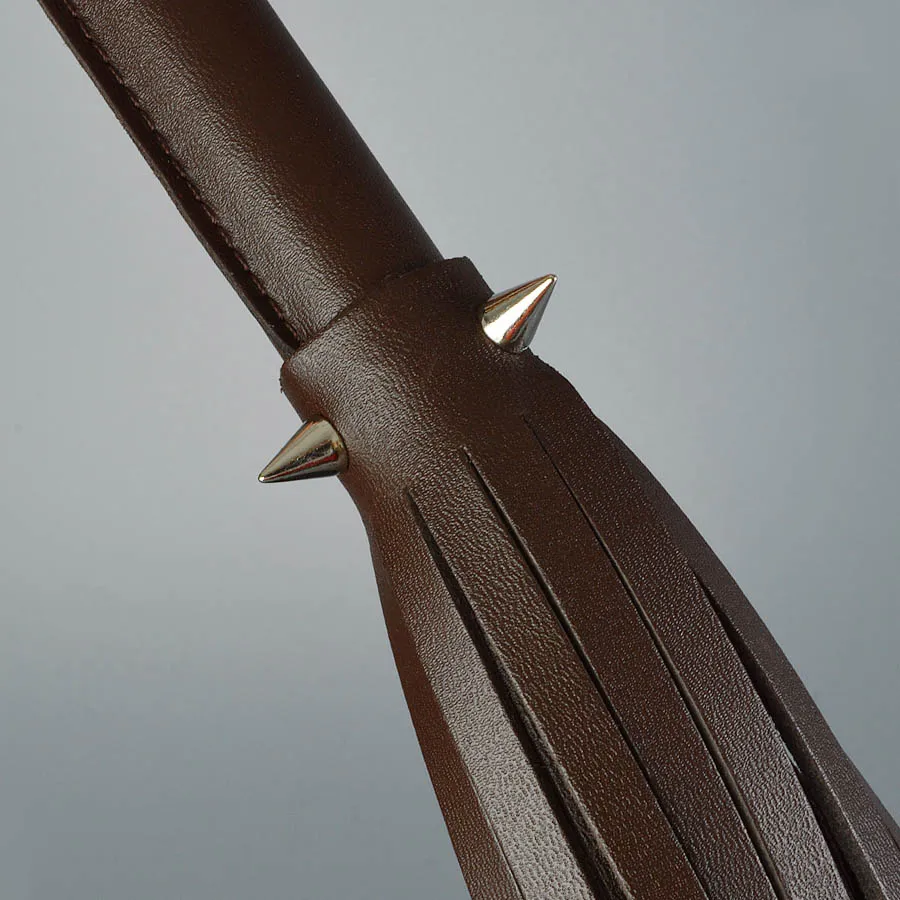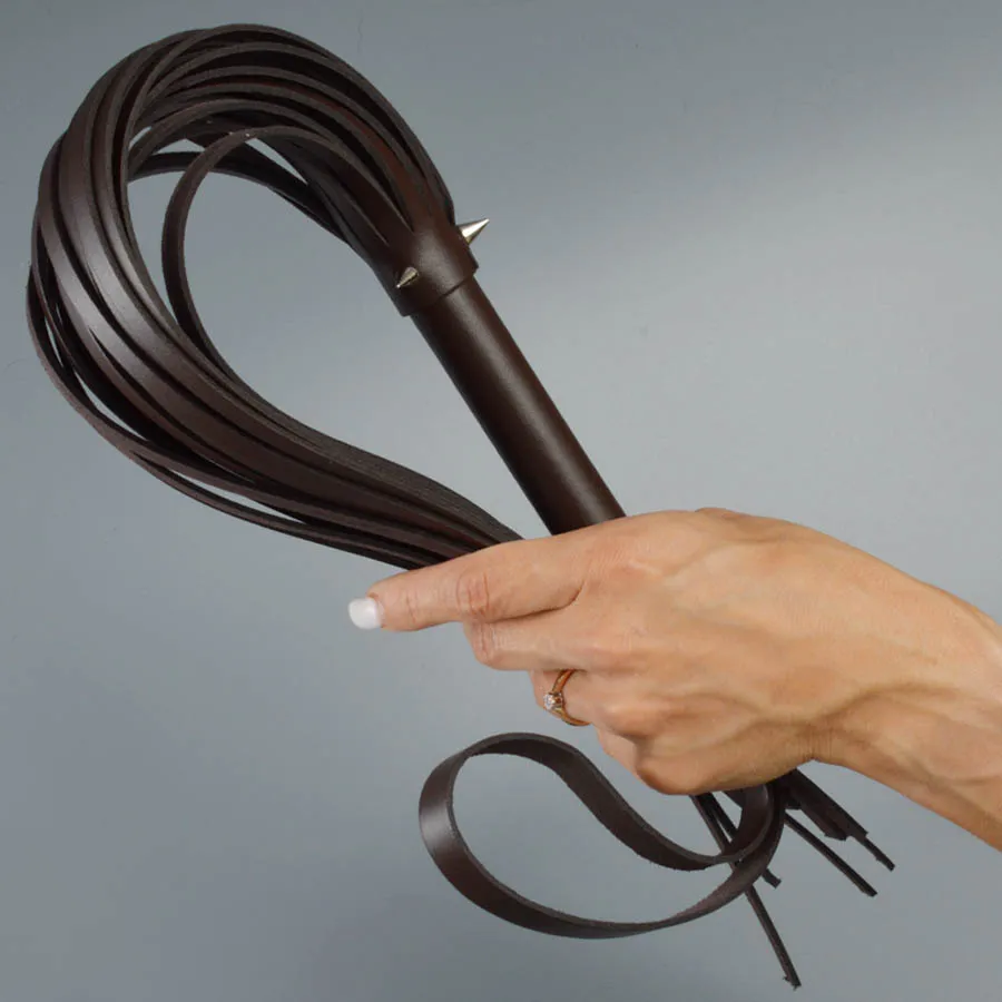 Плеть изготовлена из натуральной кожи коричневого цвета и украшена тремя металлическими шипами. Общая длина плети 55см.